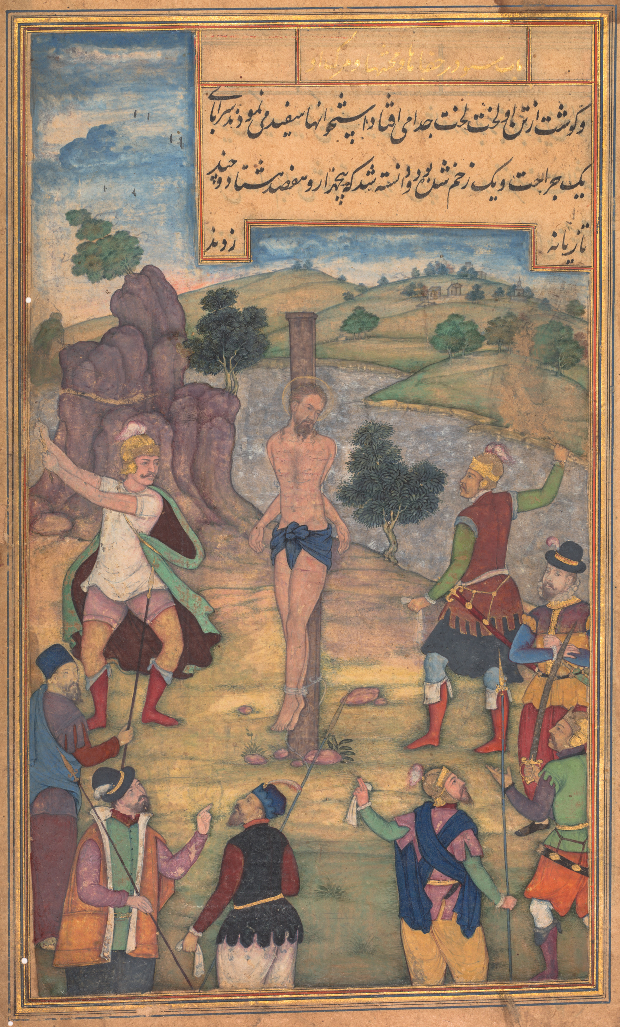 A man with a beard and no shirt or shoes is tied to a tree trunk with ropes; he wears a blue loincloth. He stands on a field with green and brown grass and pink flowers. Eight men in colorful clothes, with head coverings and some with long spears, surround him. A rocky cliff to the left meets a blue and white sky with a few white clouds. A box with foreign writing, likely in Arabic script, sits above the scene. The box and scene are surrounded by a thin gold line on a tan background.