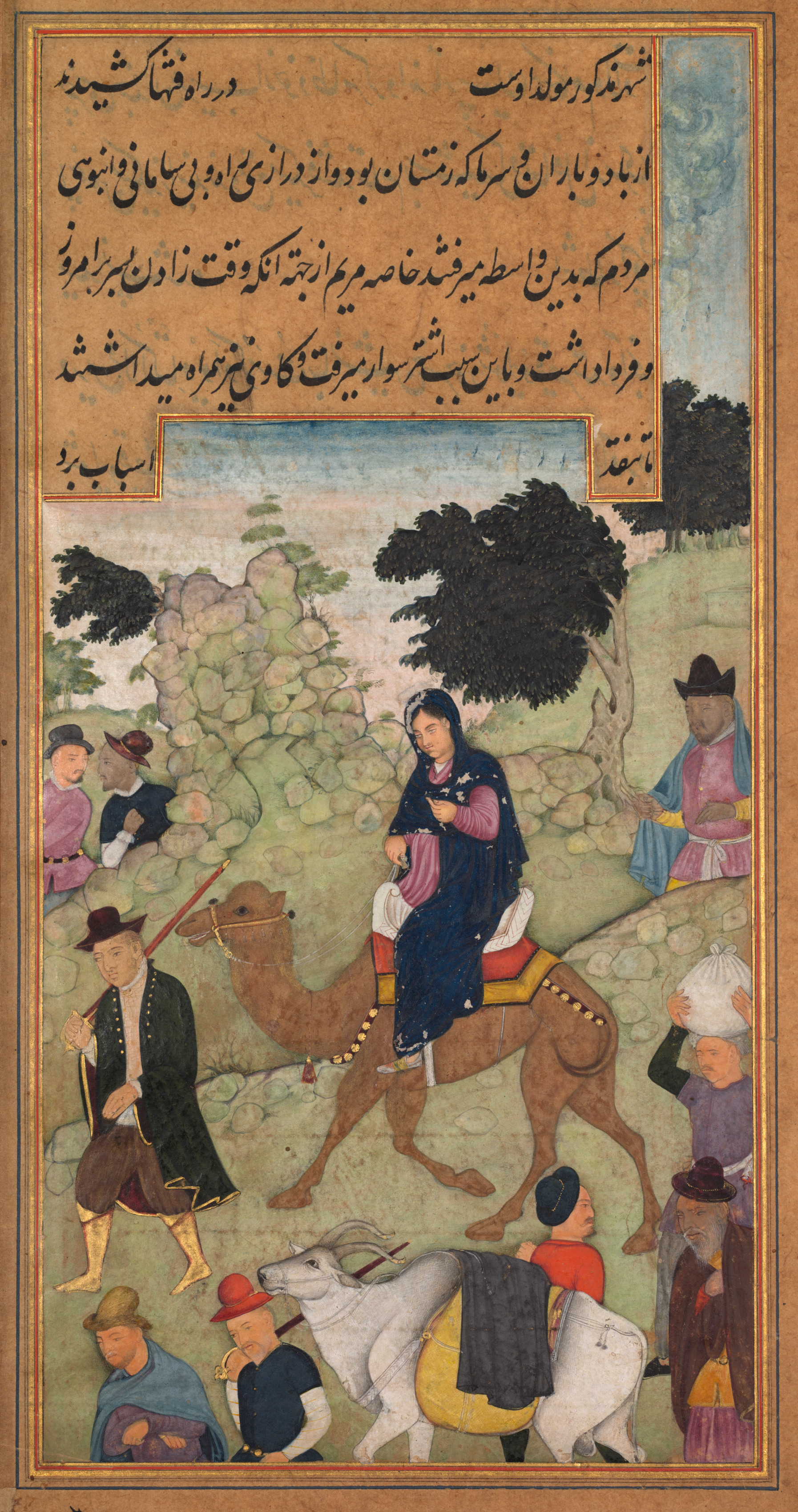 The image depicts a scene with a woman sitting on a camel. The woman wears a dark blue robe over a pink and white garment and a head covering. A man in a green tunic and hat walks beside the camel holding a stick. A man and woman walk behind a white bull in the foreground. A man sits on a stone wall to the right. A text box at the top contains black calligraphy on a brown background. The border around the image is brown with gold trim. The scene is set against a backdrop of trees and a blue sky.