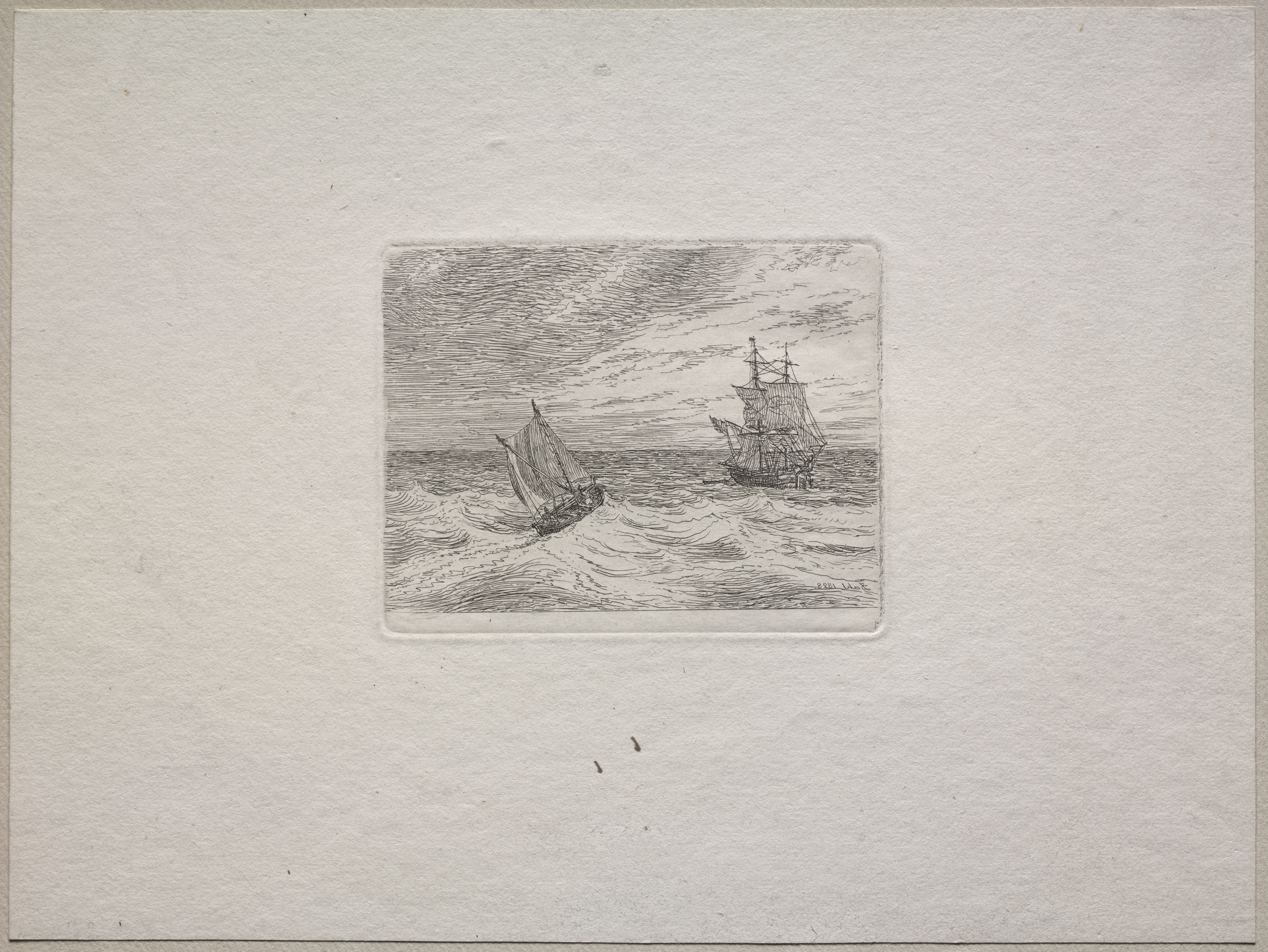 The image depicts a black and white drawing of two sailing ships on rough seas. The larger ship, a two-master with two masts, is positioned on the right side of the image, while a smaller sailboat is on the left. The two-master has multiple sails, while the sailboat has one large sail. The sky above is cloudy and dark. The water appears choppy, with waves visible around the ships. The drawing is set within a rectangular border and is placed on a piece of off-white paper with a rough texture. The paper has a slightly darker border around the drawing and a few small marks or indentations below it.