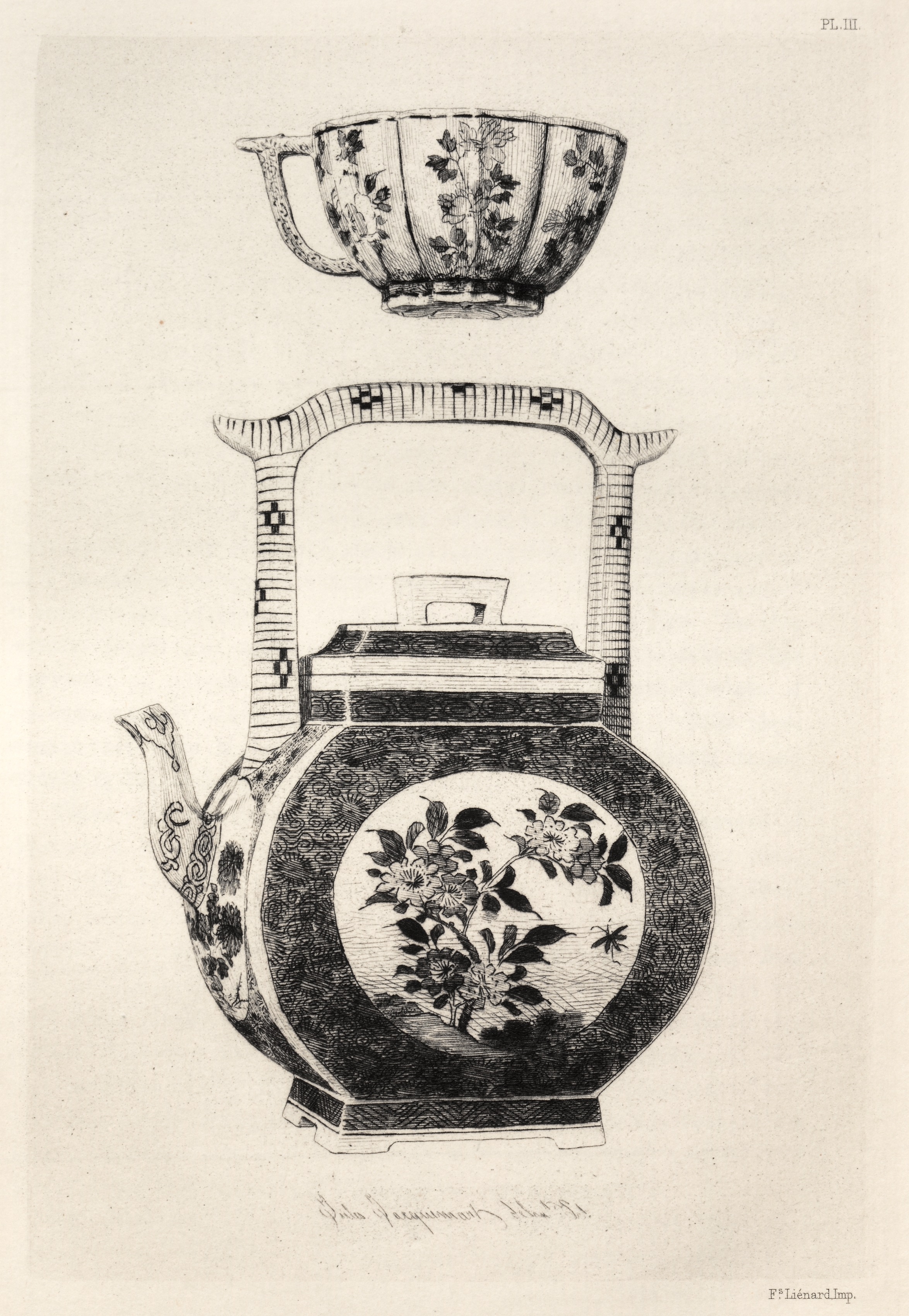 Black and white illustration of a teapot and creamer. The teapot has a round body, curved spout to the left and a curved handle on the right; flowers on the front; a dark line pattern around the bottom; and a square base. The teapot's lid has a small handle. The creamer is above the teapot and has one handle; a wide, rounded body; and a floral pattern. The creamer and teapot are connected by an arch with pillars on either side; the pillars have a square and rectangle pattern. The background is beige. The image has a small inscription at the bottom and small text in the top right corner.