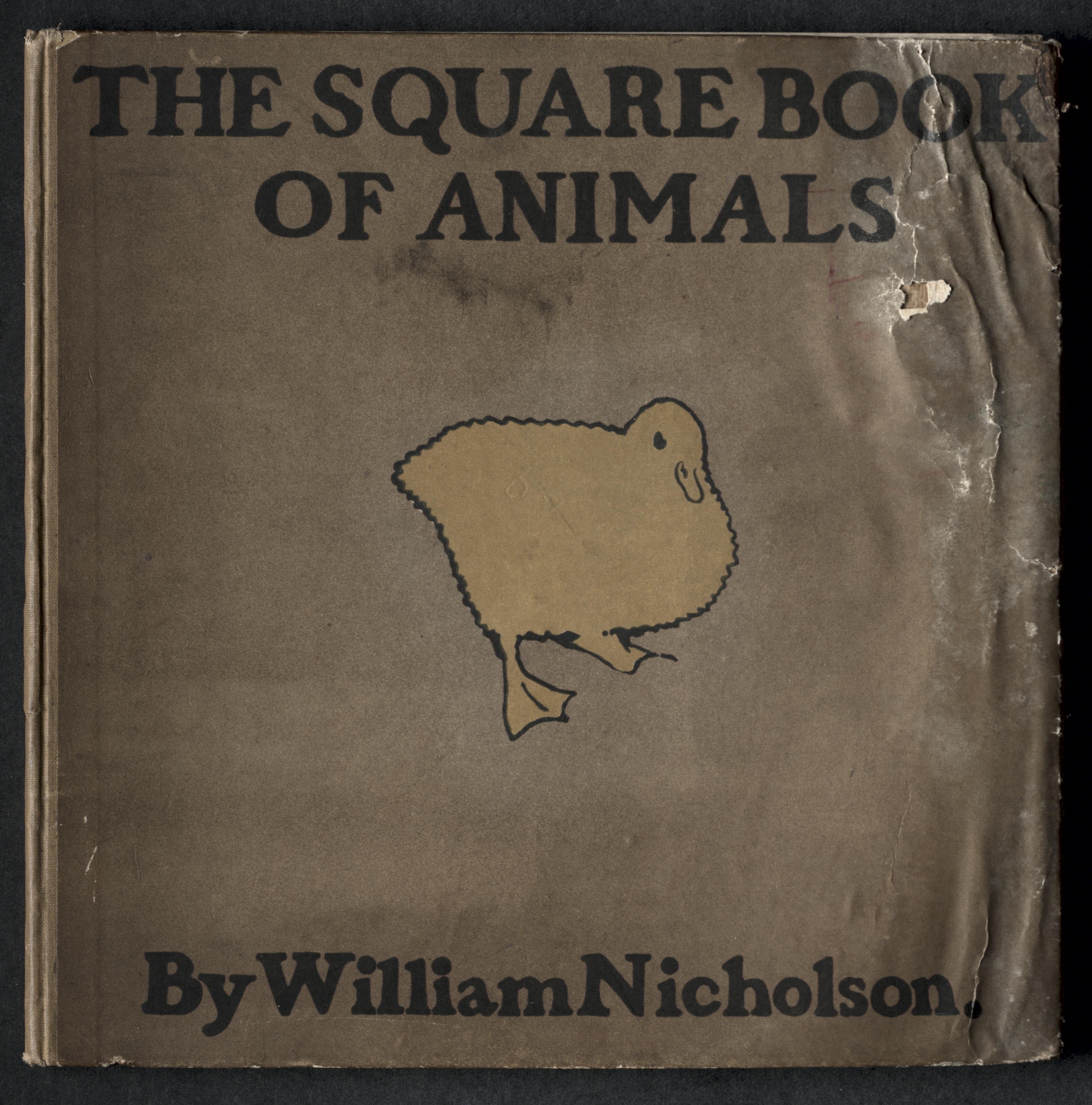 Brown book cover with black text reading "THE SQUARE BOOK OF ANIMALS" at the top and "By William Nicholson" at the bottom. A simple line drawing of a duck or similar waterfowl in a light brown color with a black outline is centered on the cover. The cover appears worn, with visible creases, tears, and discoloration.
