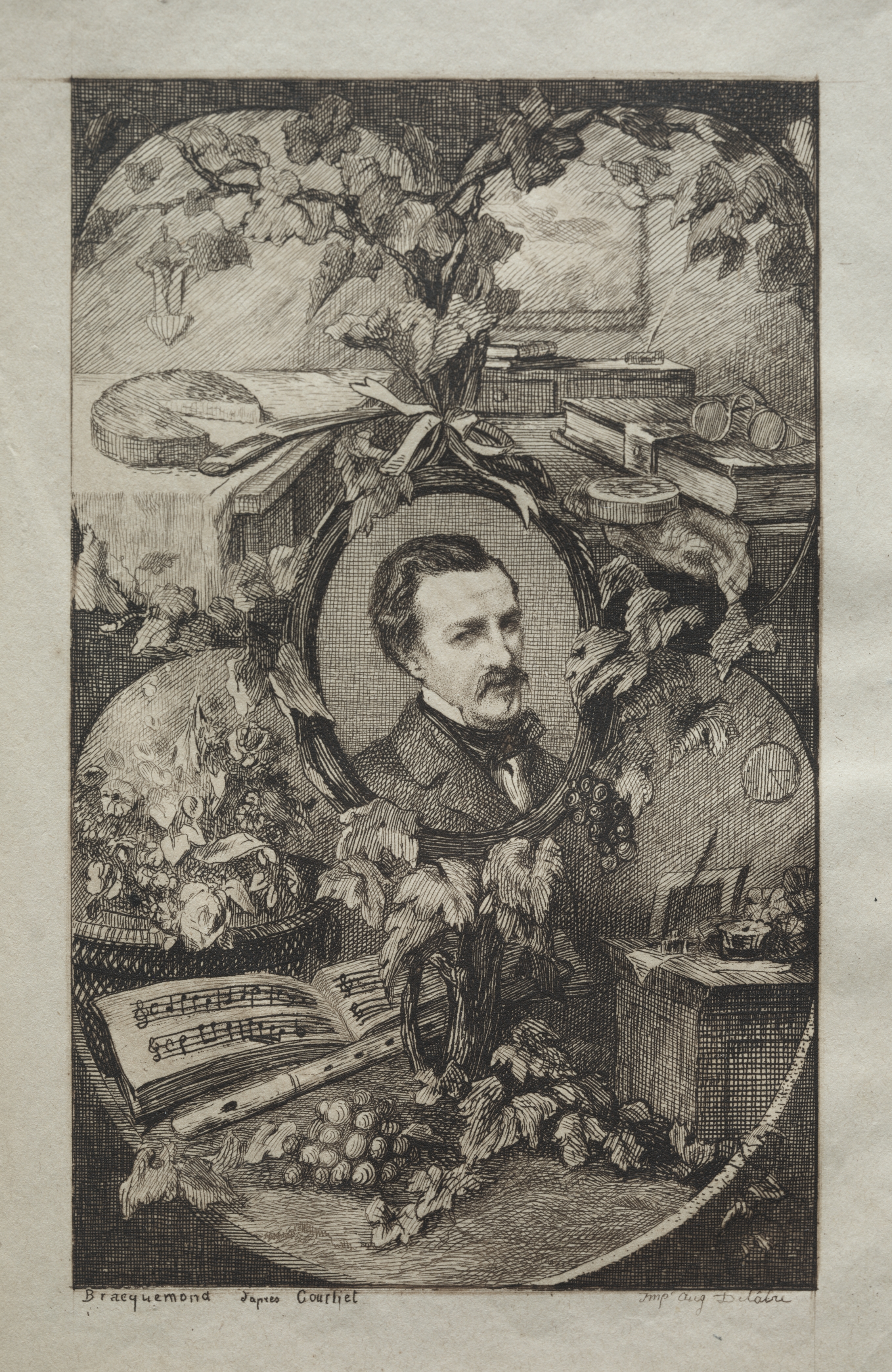 Black and white image. Portrait of a man in a suit with short hair and a mustache in center. The man is surrounded by a floral oval wreath. The wreath sits on a table with a book, fruit, and a flute. There are more books and a vase with flowers behind the wreath. The background includes trees and a lamp post. The image is detailed with cross-hatching and shading. The image has a border around it.