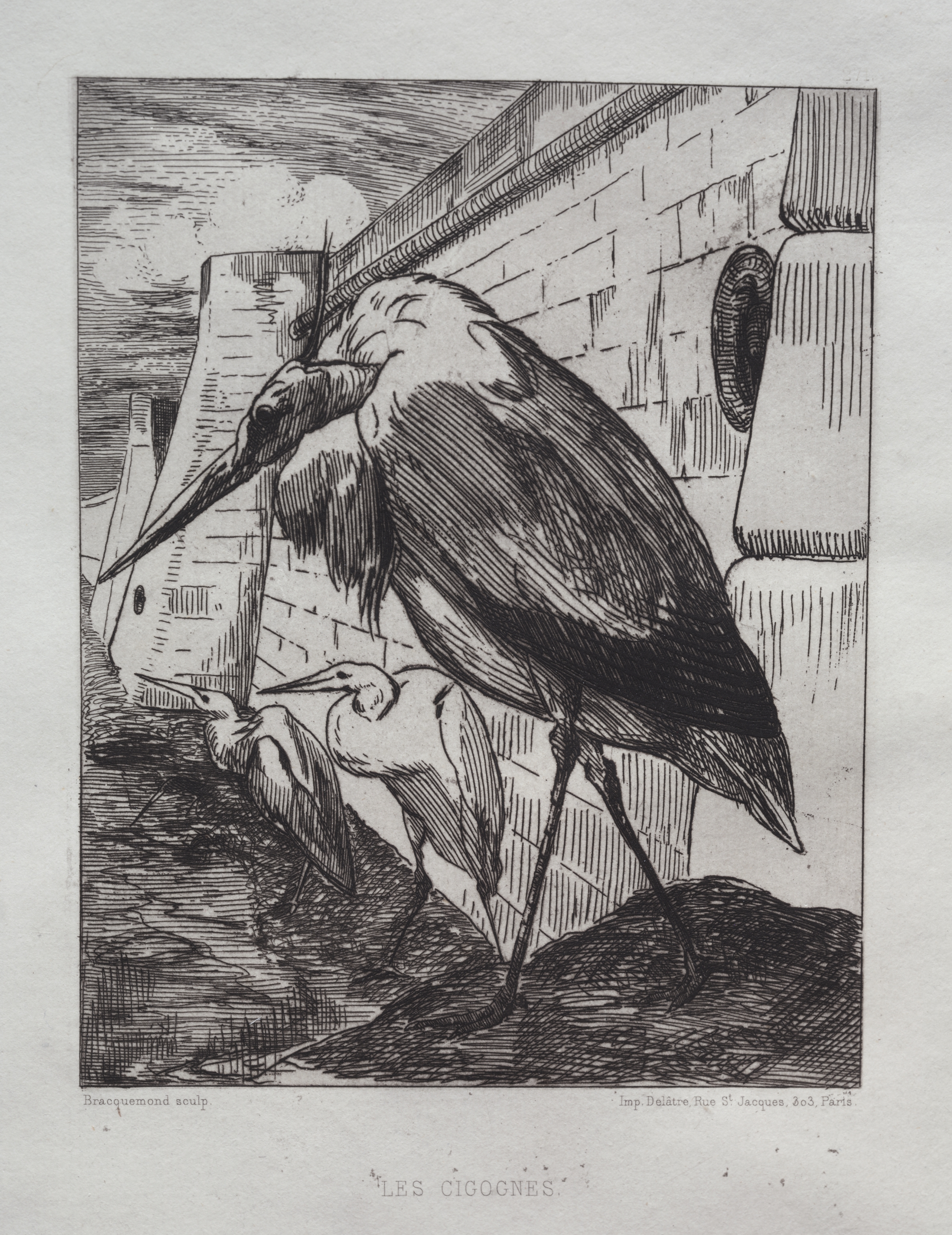 Black and white image of a large bird standing with another bird. The standing bird has its head lowered and long beak pointing towards the ground. The smaller bird sits on the ground looking up at the standing bird. They are in front of a brick wall with a building behind them. The image caption at the bottom is "The Storks".