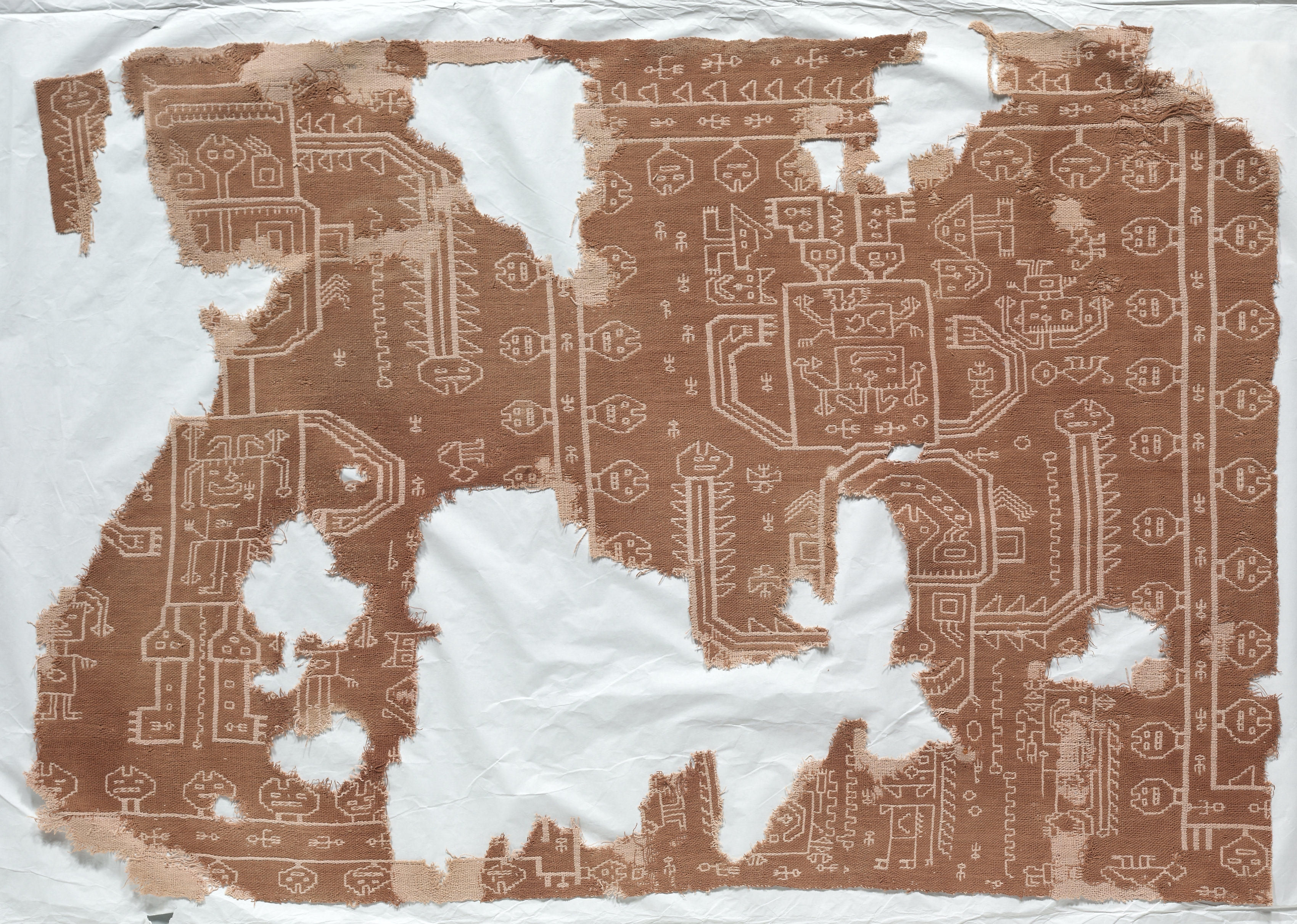 Fragment of a Mantle with Oculate Being by Andean. The image shows a fragment of a textile with a brown background and white designs. The fabric is torn and frayed around the edges, with several holes and tears throughout. The fabric is mounted on a white surface, possibly paper or cloth. The designs on the fabric include geometric shapes, such as rectangles, triangles, and circles. Some of the shapes have eyes or other facial features, giving them a stylized, possibly being-like appearance. The designs are arranged in a repeating pattern across the fabric. The fabric appears to be made of a coarse, woven material, possibly cotton or wool. The overall color of the fabric is a light-brown or beige color. The white designs are intricate and detailed, with many small lines and shapes. The fabric is likely from an ancient or traditional Andean culture. The image is a close-up view of the fabric, with no other objects or context visible.