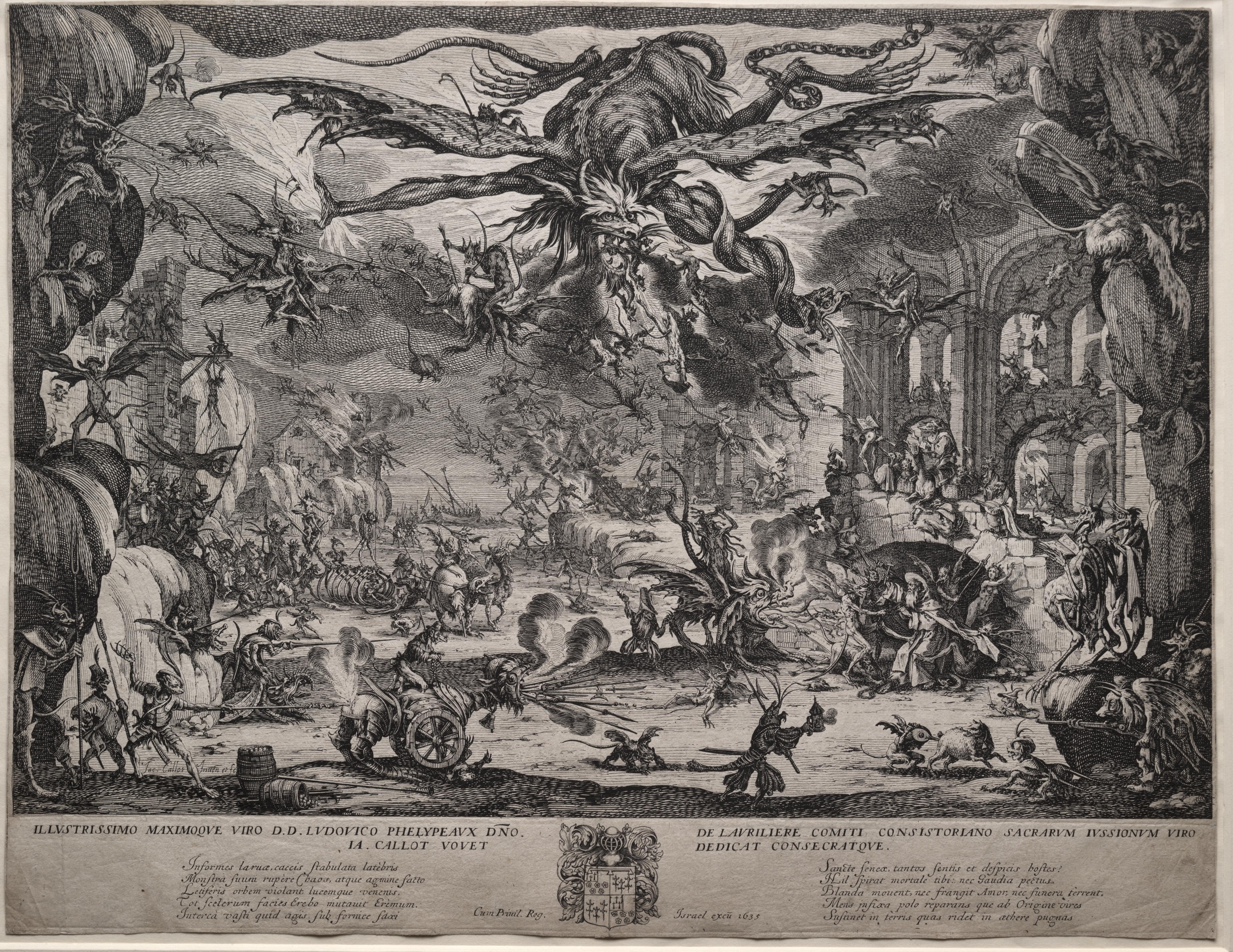 Black and white etching of a chaotic scene. A large creature with wings and tentacles dominates the top center. The creature has a large head with a long snout and sharp teeth. It holds a chain in one hand. Demons and monsters of various types fill the scene. Some have wings, others have horns or tails. A man with a halo is visible on the right side. He appears to be defending himself. A ruined landscape with crumbling buildings and trees fills the background. The sky is dark with clouds. Text is written in Latin at the bottom, with a coat of arms in the center.
