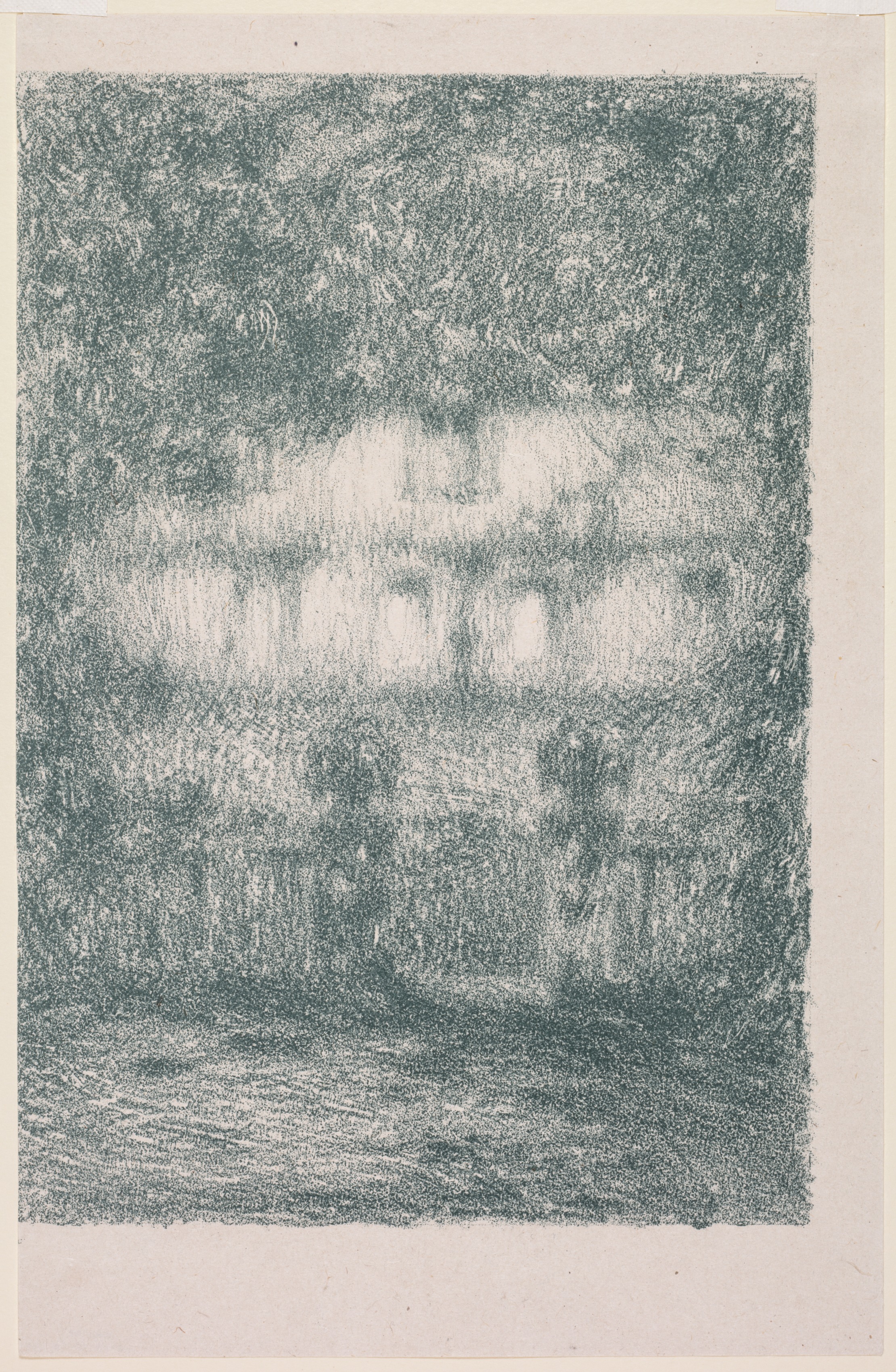 The House in Moonlight by Henri Le Sidaner: A gray and white sketch of a house with several windows at nighttime. The house is two stories, with a row of four lit windows on the second story and two lit windows on the first story. The house is surrounded by dark trees and there is a walkway in front. The entire scene is drawn in a pointillism style. The image has a thick white border around it.