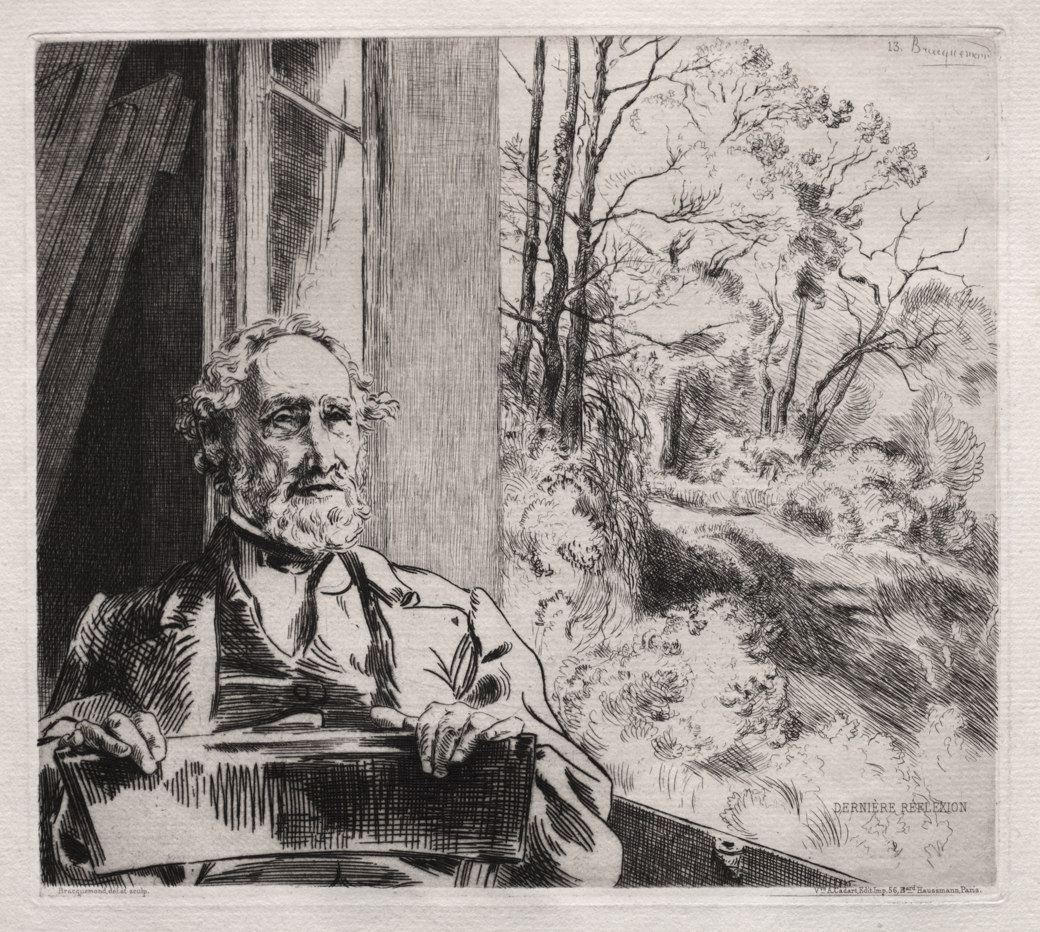 Black and white drawing of a man sitting by a window. The man has curly hair and a beard. He wears a suit jacket and vest with a necktie. His arms rest on a windowsill. Behind him is a window with an open curtain. Outside the window is a wooded scene with trees and bushes. The drawing is titled "Portrait of Meyer Heine" and is by Félix Bracquemond.