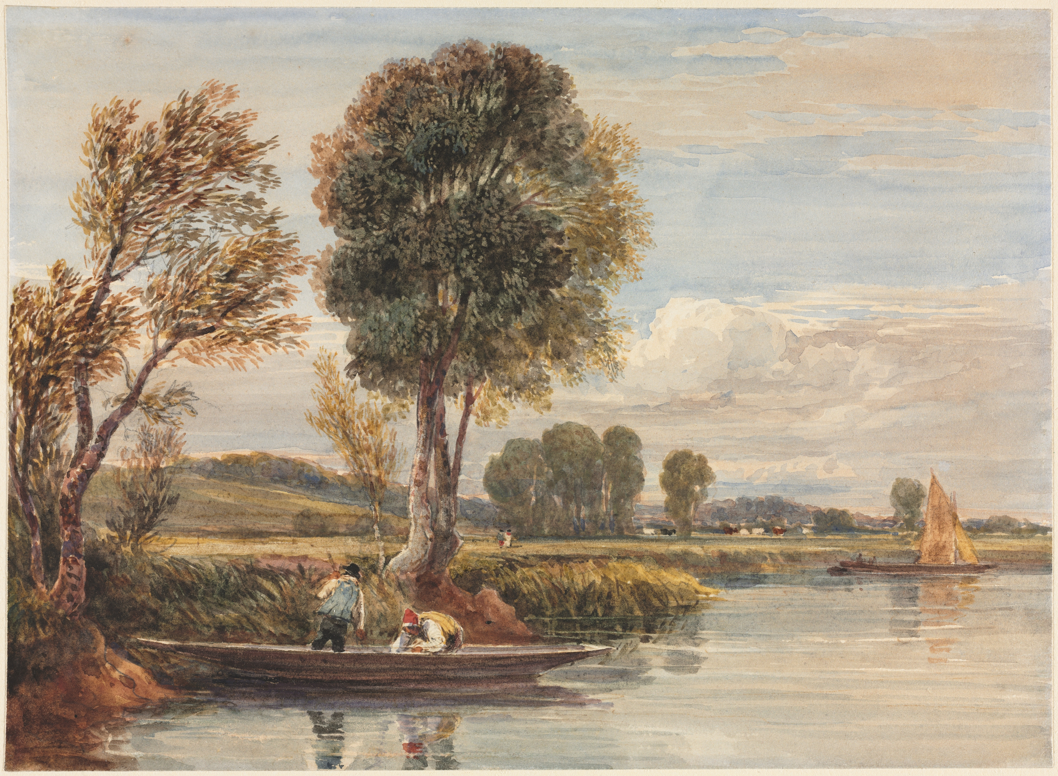 On the Thames by David Cox. A river scene with a boat in the foreground, and another boat with a sail in the background. Two people are in the boat in the foreground, one standing and one sitting. The riverbank has grass and trees. The sky is cloudy. The river reflects the sky and trees. The scene is outdoors. There are rolling hills and more trees in the background. A fence is visible on the riverbank. The colors used are muted, with shades of brown, green, and blue.