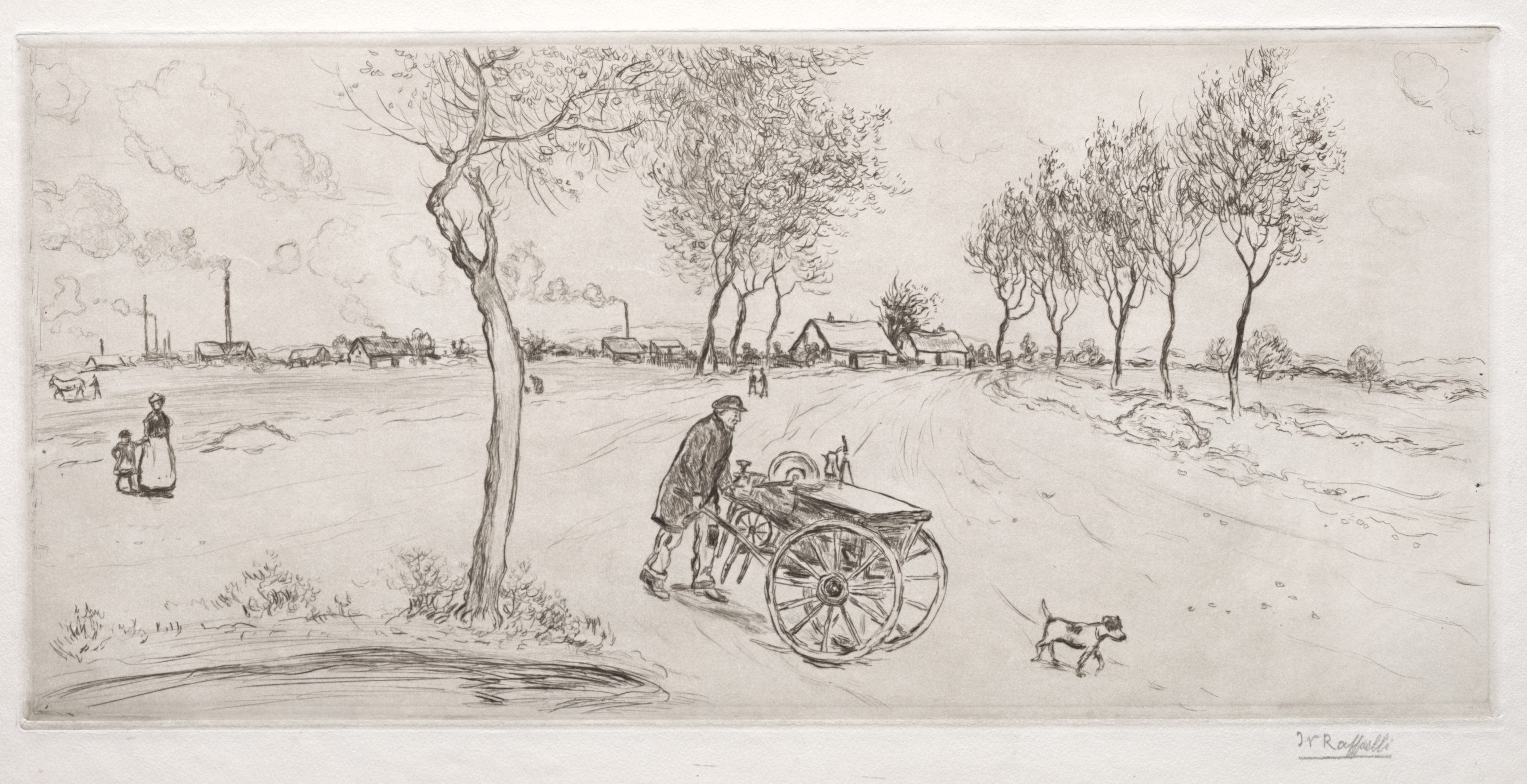 The Knifesharpener by Jean-François Raffaëlli: A pencil drawing of a man pushing a cart with large wheels containing a box-like object with a sharpening wheel on top, on a dirt road with a dog beside him. A woman and child stand on the left. The road runs from bottom right to center left. Trees line the right side of the road. Buildings, smokestacks and clouds in the background.