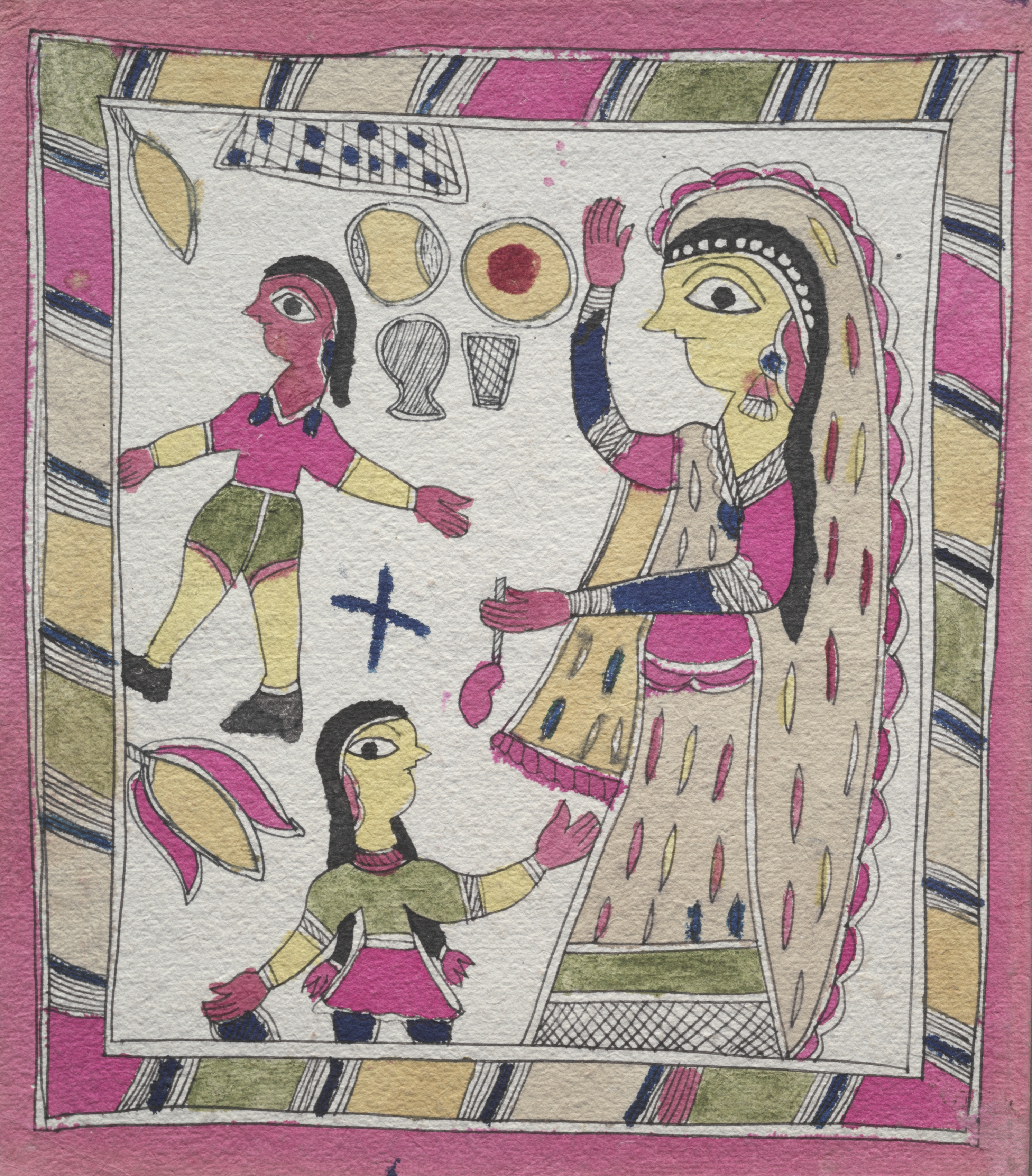 The image depicts a drawing of "Three Figures: woman with two children playing ball". The drawing has a pink border and a colorful background with diagonal stripes. Inside the border, there is a white square containing three figures. The largest figure is a woman on the right side wearing a pink and beige dress with a headscarf. She has her right hand raised and her left hand holding an object. There are two smaller figures to the left of the woman. The top figure is a child wearing a pink shirt and green shorts. The bottom figure is another child wearing a green shirt and pink skirt. The children appear to be playing with a ball. Above the children are four circular objects. There is a blue cross shape between the children. The drawing style appears to be traditional Indian folk art.