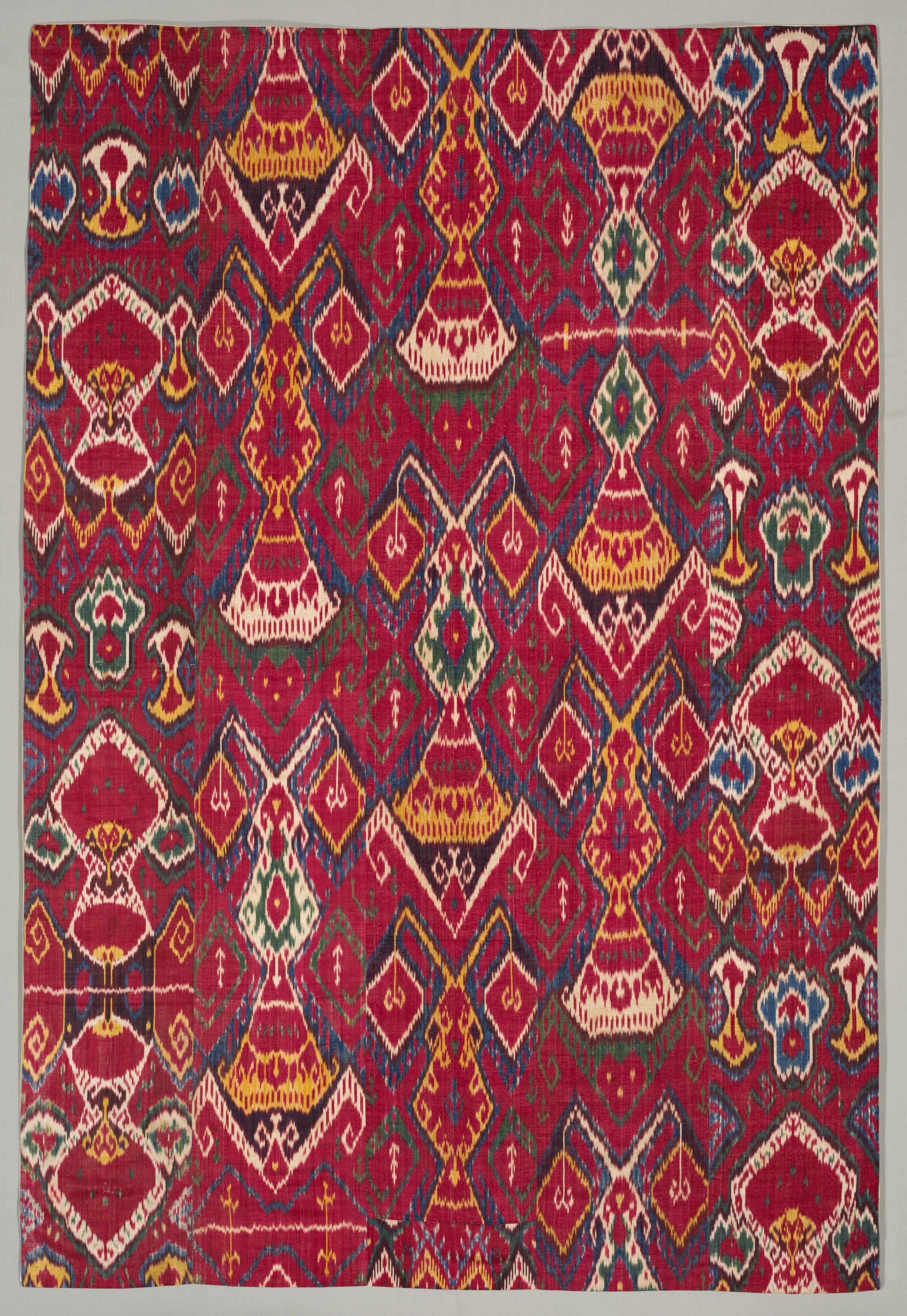 Red fabric with diamond and teardrop shapes in various colors including yellow, blue, white, black, and green; some outlined in white. The background is predominantly red with a repeating pattern of geometric shapes. The fabric appears to be a textile art piece, specifically a wall hanging, also known as a pardah.