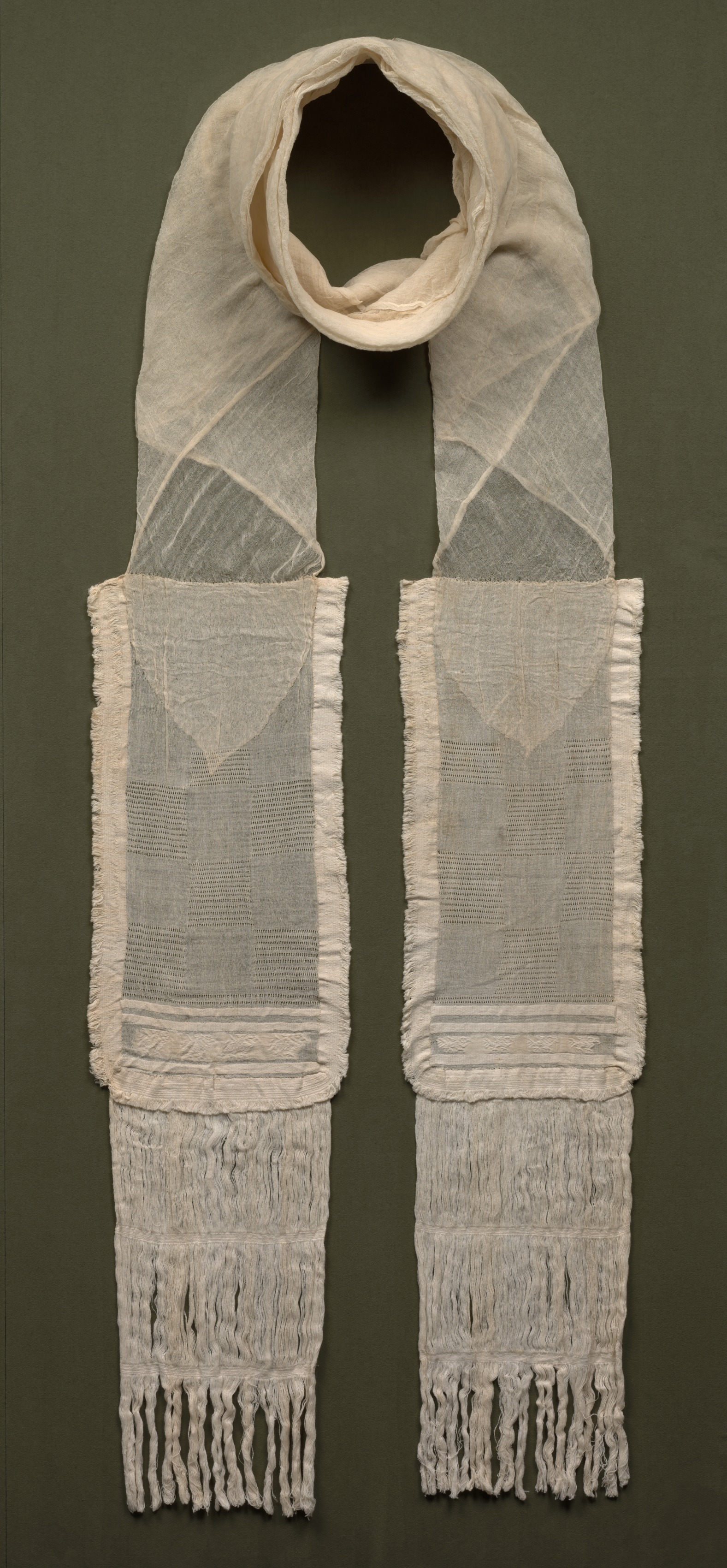 Light beige scarf, made of semi-transparent fabric, scarf looped at top, two long ends hanging down; each end with geometric pattern at top; fringed edges; dark green background; by artist Turban.