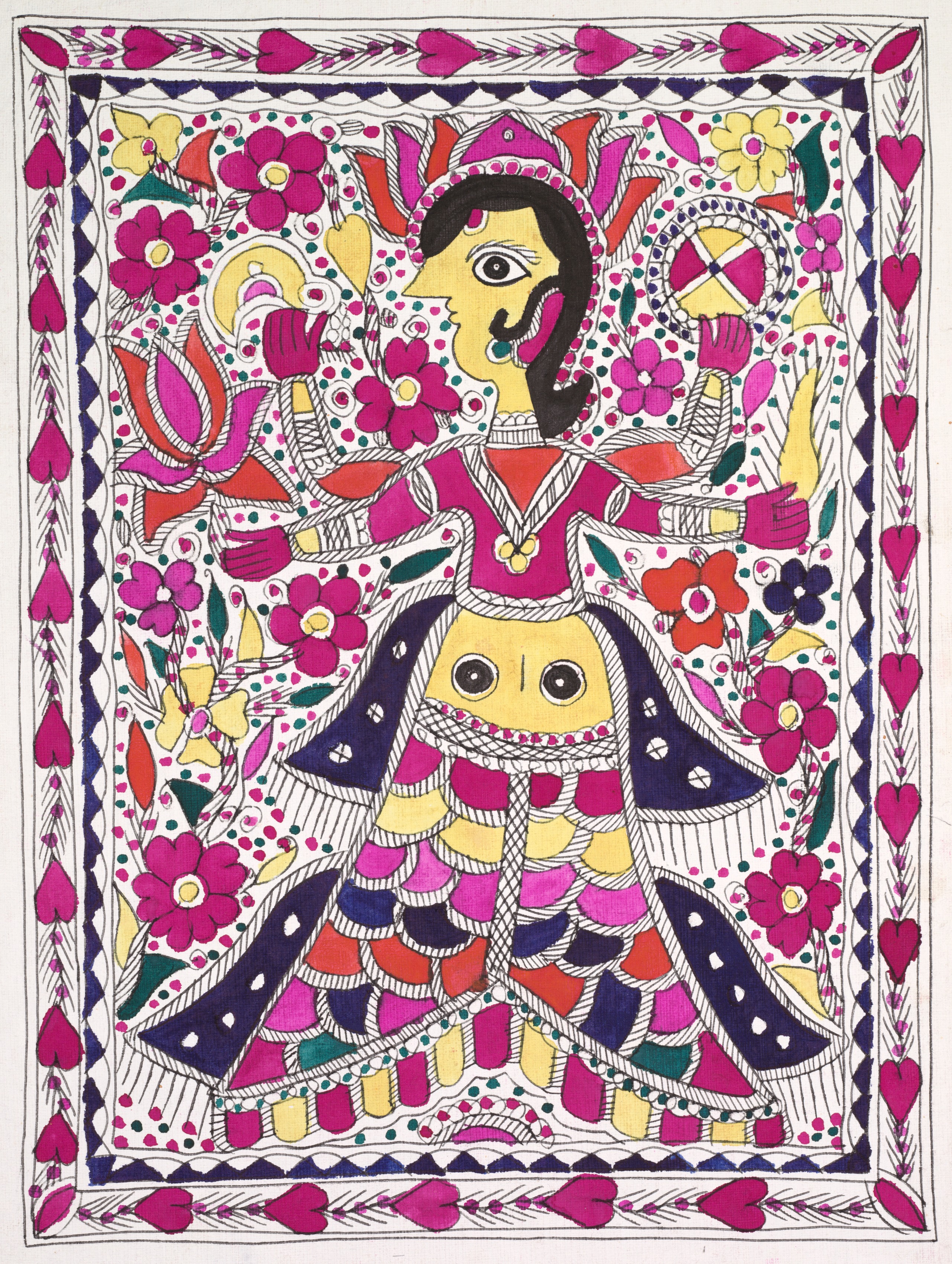 Four-armed goddess with a yellow face, black hair, and a bindi on her forehead. She wears a pink top with white trim, a multicolored skirt with pink, purple, red, orange, and yellow hues, and a dark purple shawl with white details. Her four arms are adorned with bracelets. The background features pink, yellow, red, and purple flowers, green leaves, and small dots. A border of pink hearts and blue and white geometric patterns surrounds the image. The artwork is attributed to an artist known for the style, and the title is "Four-armed goddess, with hearts in margin".