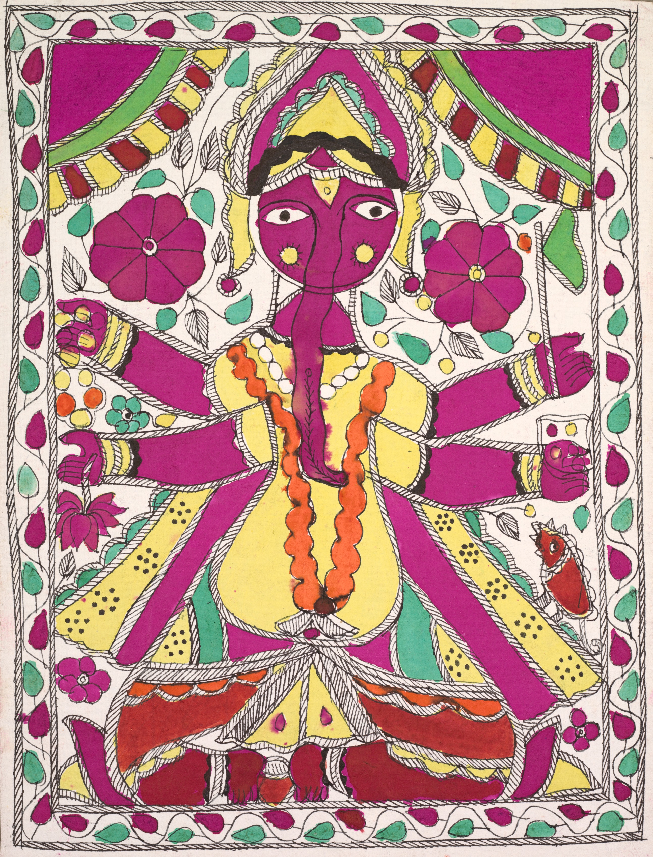 Multi-armed figure facing outwards with a pink face, yellow and pink headdress, and a long nose. The figure has a yellow body with a red and orange lower garment. There are eight arms. The background includes pink flowers, green leaves, and a white background with a border of green and pink teardrop shapes. The figure has a pink and yellow garment and several bracelets on each arm. The figure has a long orange necklace. The figure appears to have a pink and green and yellow background behind the head. The figure has a red object near the lower right corner.