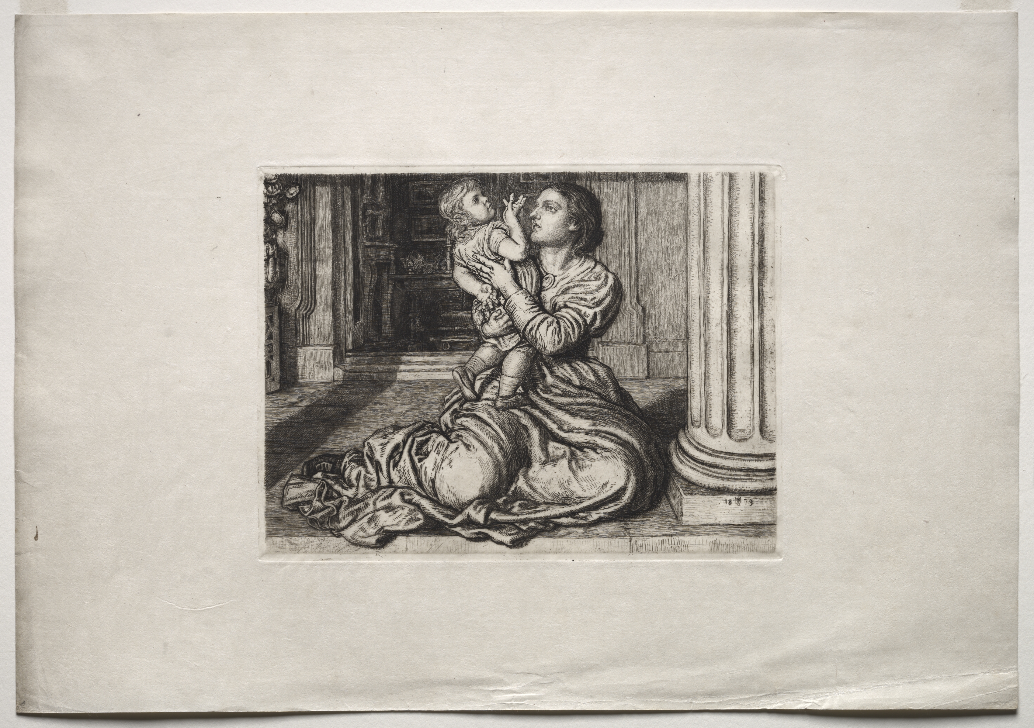The image shows a black-and-white drawing of a woman and child. The woman sits on the floor with her knees bent and her back against a column. She wears a long dress with long sleeves. The woman holds a young child on her right hip with the child's right leg bent and resting on her right thigh. The child touches the woman's face with their right hand. The woman looks up at the child. The background includes a tiled floor with a rug or cloth on it, a hallway with a doorway and another column. The image is in a rectangular cutout in a piece of off-white paper.