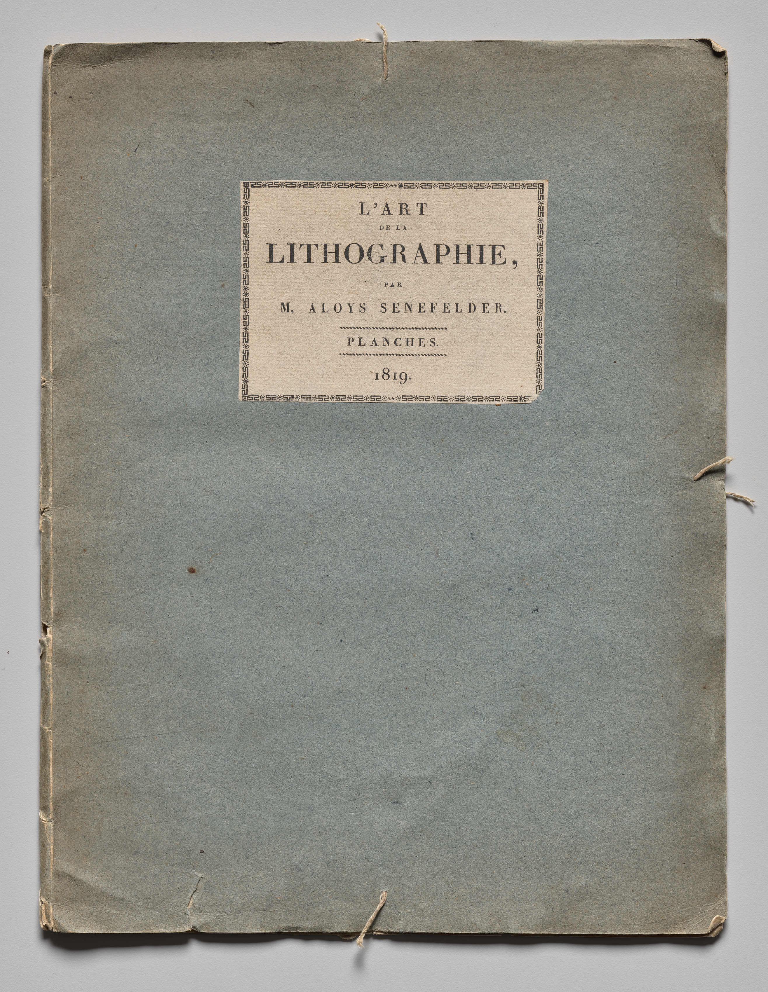 The book cover is gray with a cream-colored label in the center. The label has a decorative border and contains the following text in black: - L'ART - DE LA - LITHOGRAPHIE, - PAR - M. ALOYS SENEFELDER. - PLANCHES. - 1819. The cover appears worn, with visible signs of aging and use, including discoloration, tears, and frayed edges. It is set against a light grey background.