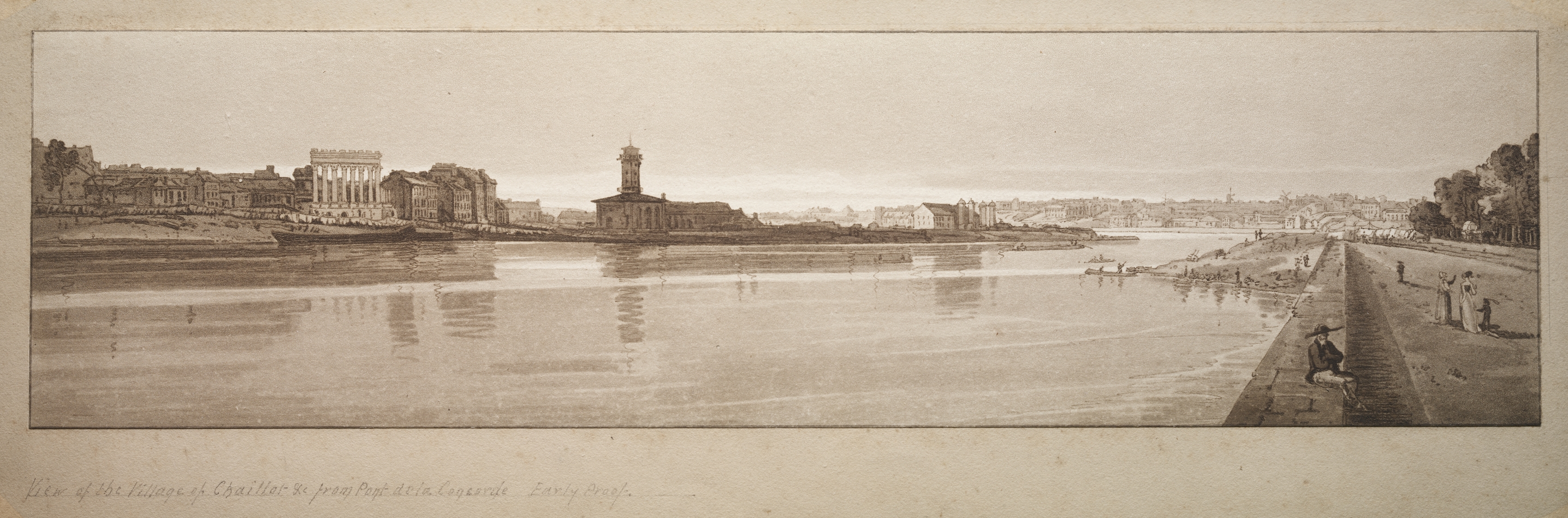 Sepia-toned landscape drawing of a river scene. A large body of water occupies center and left, reflecting buildings along the opposite shore. The right side shows a paved walkway with people, trees, and buildings in the distance. A man sits on the edge of the walkway. Across the river, buildings line the shore, including one with columns. A tower rises from a building near center. The sky above appears overcast. The image is framed by a thin border on aged paper.
