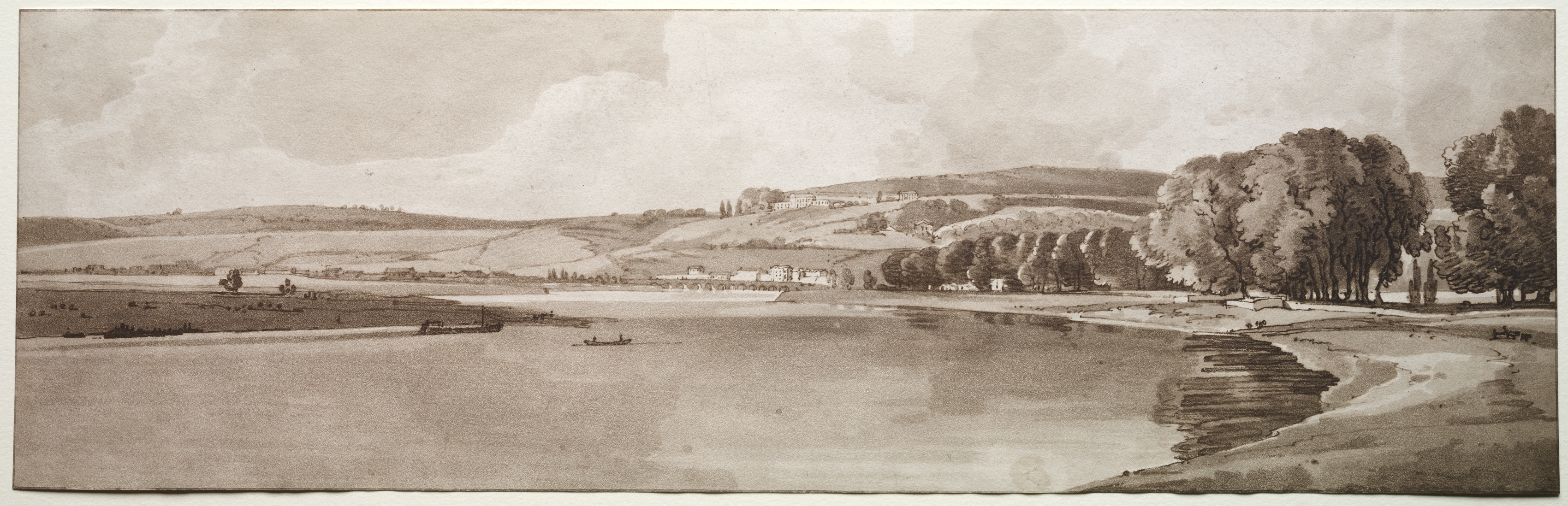 Sepia-toned landscape drawing. A river curves across the bottom. A boat is in the water. A flat area with buildings and trees borders the river on the right. A line of trees runs along the riverbank. A field borders the river on the left. A hill rises in the background with more buildings on top. The sky is cloudy. The image is rectangular and panoramic.