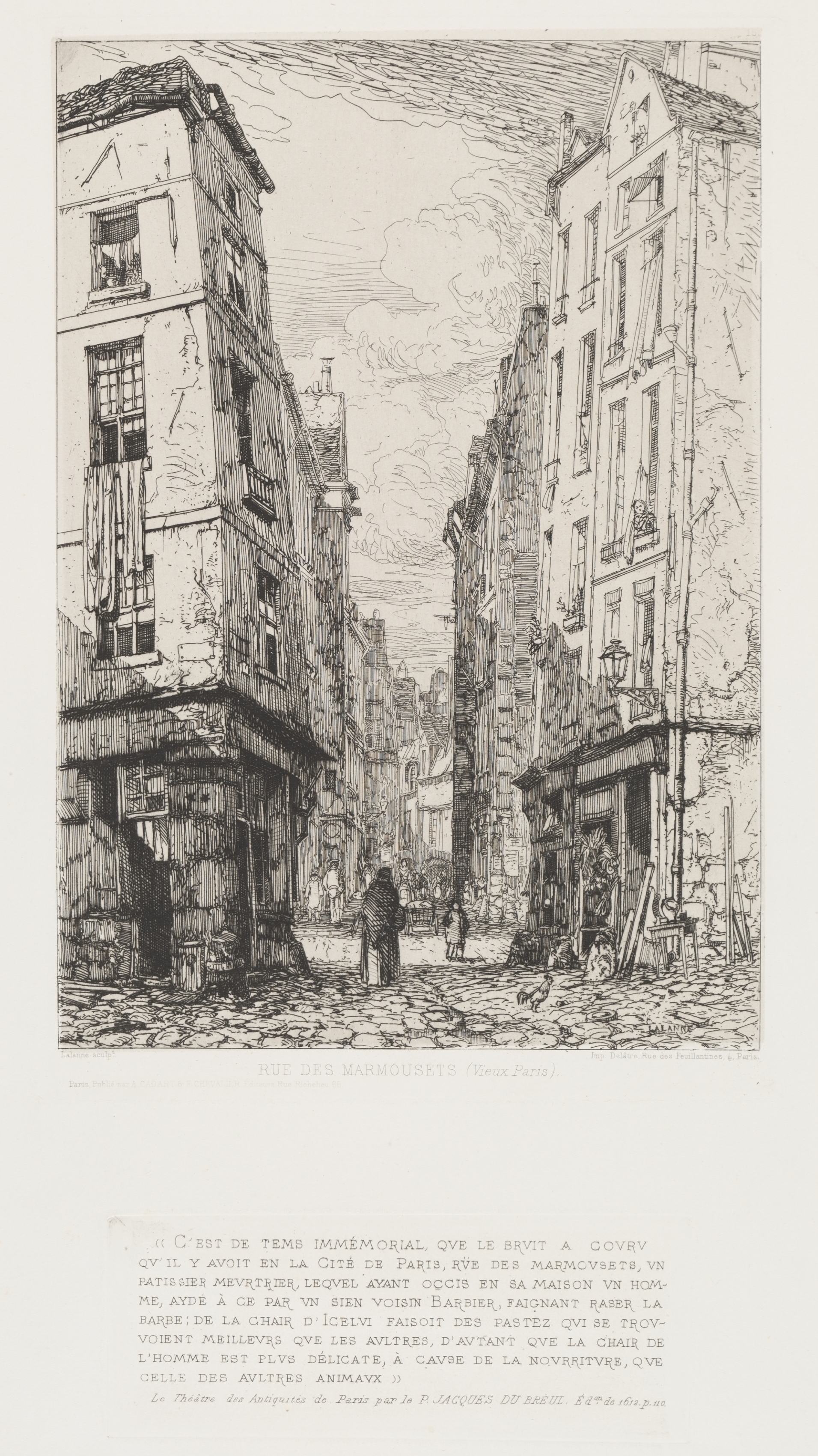 Black and white drawing of a street scene. Tall buildings line both sides of cobblestone street. Buildings are multi-story with windows and roofs. People walk down center of street. Gray cloudy sky in background. Text in French is printed below image. The title of the work, "Rue des Marmousets (Old Paris)" and the artist's name, Maxime Lalanne, are included.