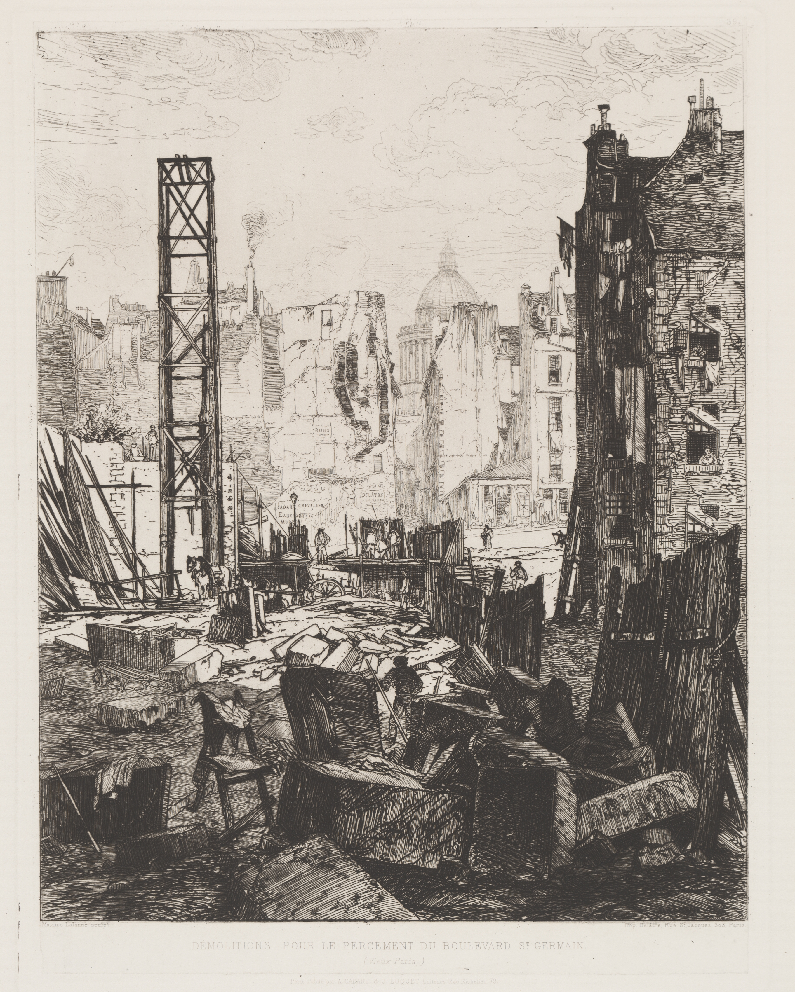 Black and white image of a city street under construction. The foreground shows a man carrying a large wooden beam, with other beams and wooden planks scattered around. A tall metal structure, possibly a crane or scaffolding, stands on the left. In the background, several buildings are visible, including one with a dome-shaped roof. The sky is cloudy. The image is an etching, with detailed lines and shading. The scene depicts demolition work, with a large pile of rubble and debris. The image is a cityscape with buildings on either side of the street. The overall tone is one of urban renewal and construction. The title of the work is "Demolition for the Opening of Boulevard St. Germain" by Maxime Lalanne.