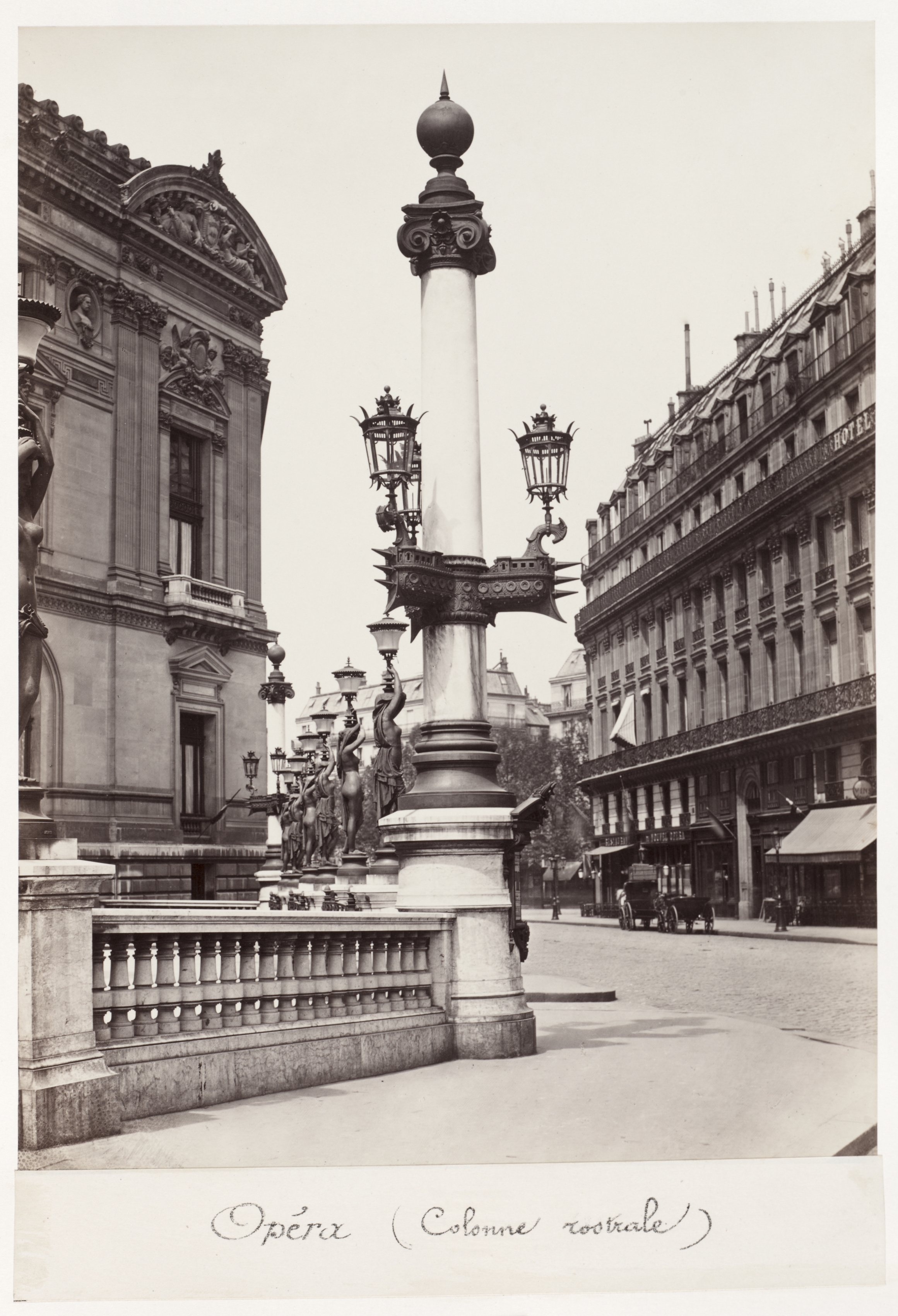 Black and white photograph of a city street. A tall white column with a decorative top and several lantern-style lights is in the center. The column sits on a concrete base with a short railing to the left. A large building with ornate carvings is on the left. A street runs along the right with a horse-drawn carriage and several people. A large building with many windows and balconies is on the right. The sky is overcast. The photograph is titled "Opéra (Colonne rostrale)" at the bottom.