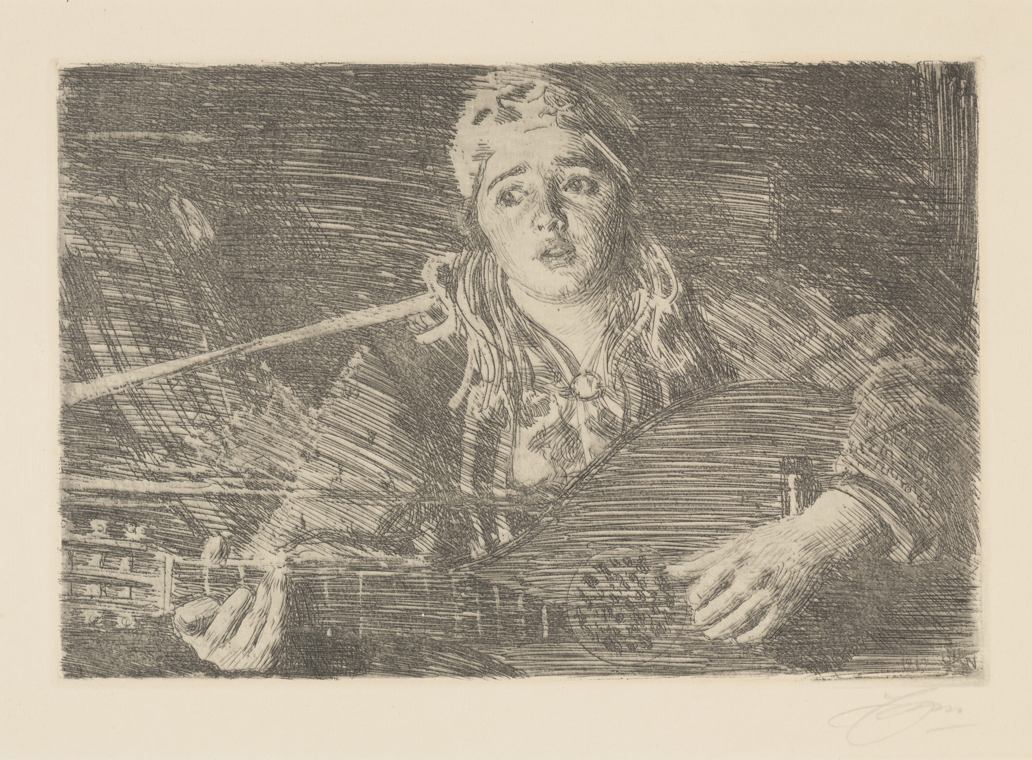 The image depicts a woman playing a mandolin, titled "Ols Maria" by Anders Zorn. The woman has long hair and wears a headscarf. The headscarf has a flower or other decoration on top. The woman's facial expression is intense; her mouth is slightly open. The woman wears a blouse with a V-neck. The mandolin has four strings and a flat back. The woman's left hand is on the neck of the mandolin and her right hand holds a plectrum. The background is dark with visible cross-hatching. The image is rendered in shades of gray on a beige background. The artist's signature appears in the bottom-right corner.