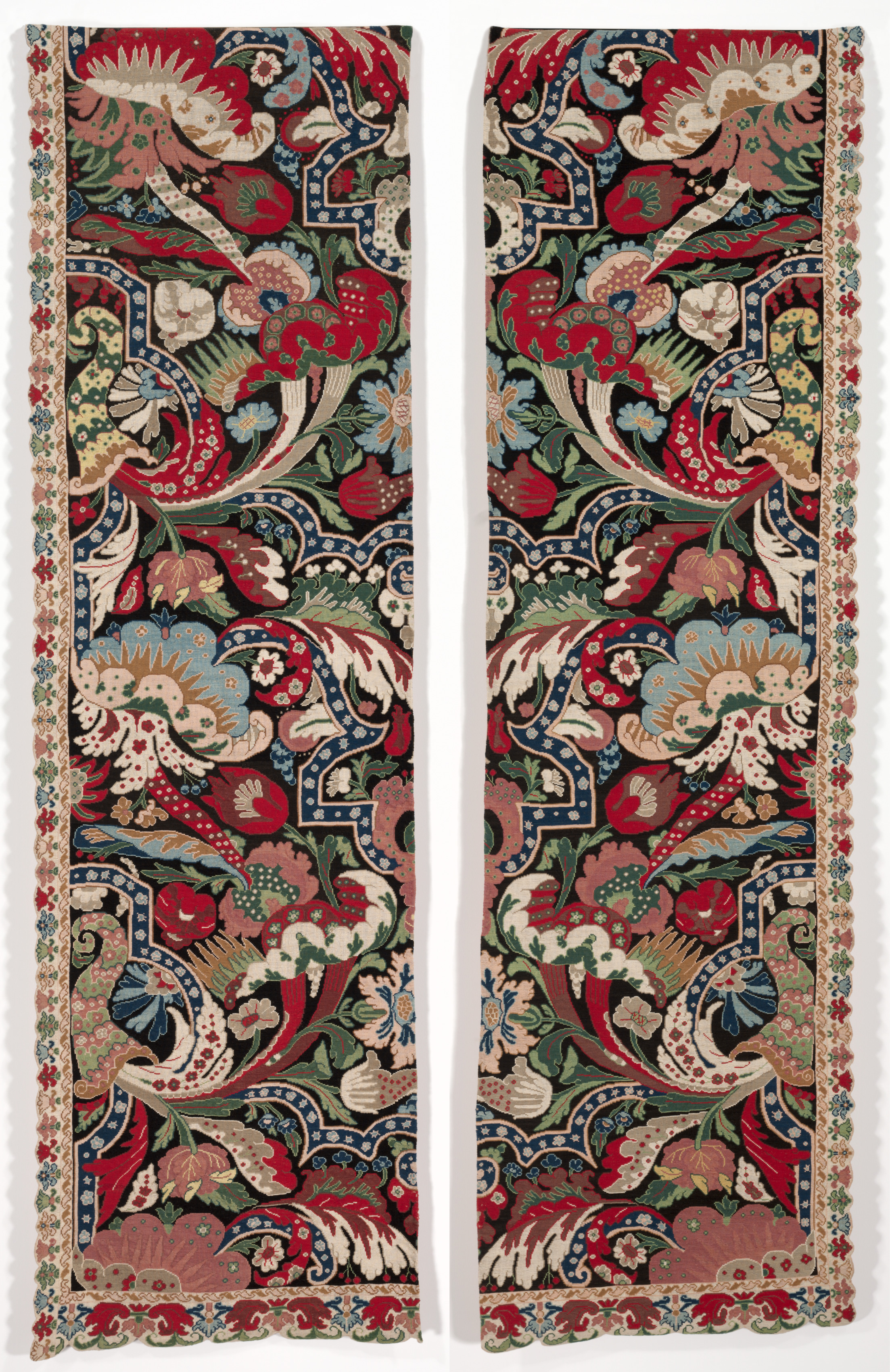 Pair of Needlework Bed Hangings in the Bizarre Style by Unknown. Two long, narrow, rectangular pieces of fabric with a floral pattern in a variety of colors, including red, blue, green, white, and pink. The fabric has a scalloped edge on both the top and bottom. The floral pattern includes flowers, leaves, and birds, and is densely packed with intricate designs. The pattern on both pieces is identical but mirrored. The fabric appears to be made of silk or another shiny material. The background of the image is white.