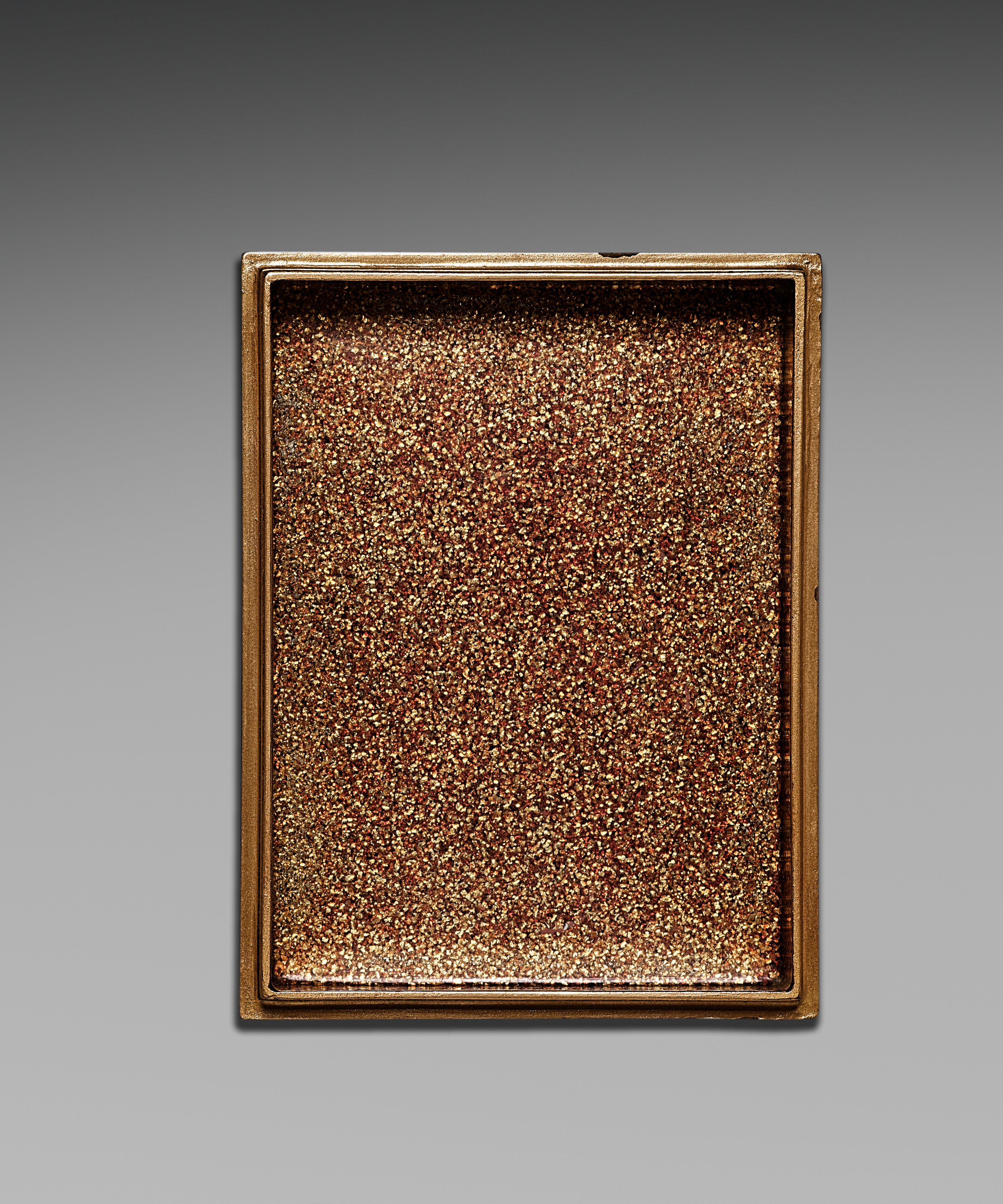 Rectangular, gold-colored frame with a speckled brown and gold inner surface; contains no visible chrysanthemums; speckled surface resembles small dots or grains; frame appears to have a lip around the edge; background fades from dark gray to light gray; no other objects or features visible. Nested Boxes with Chrysanthemums (inner box) by artist.