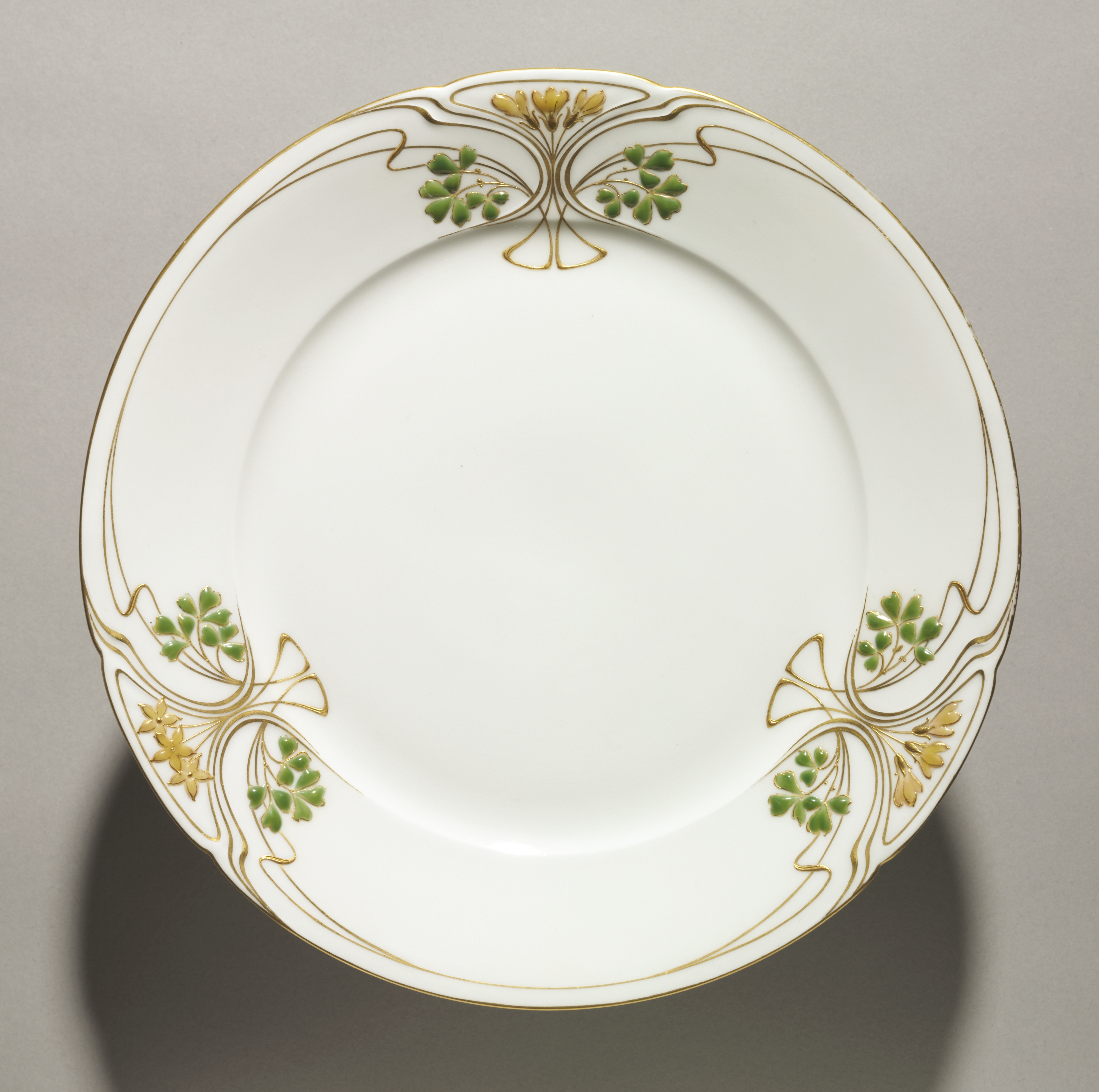 White plate with a wide rim. Gold lines form a border around the rim with three symmetrical floral motifs. Each motif consists of a gold flower at top center with green leaves on either side, mirrored on the bottom left and right of the plate. The plate is on a gray background with a shadow underneath. The plate is by KPM.