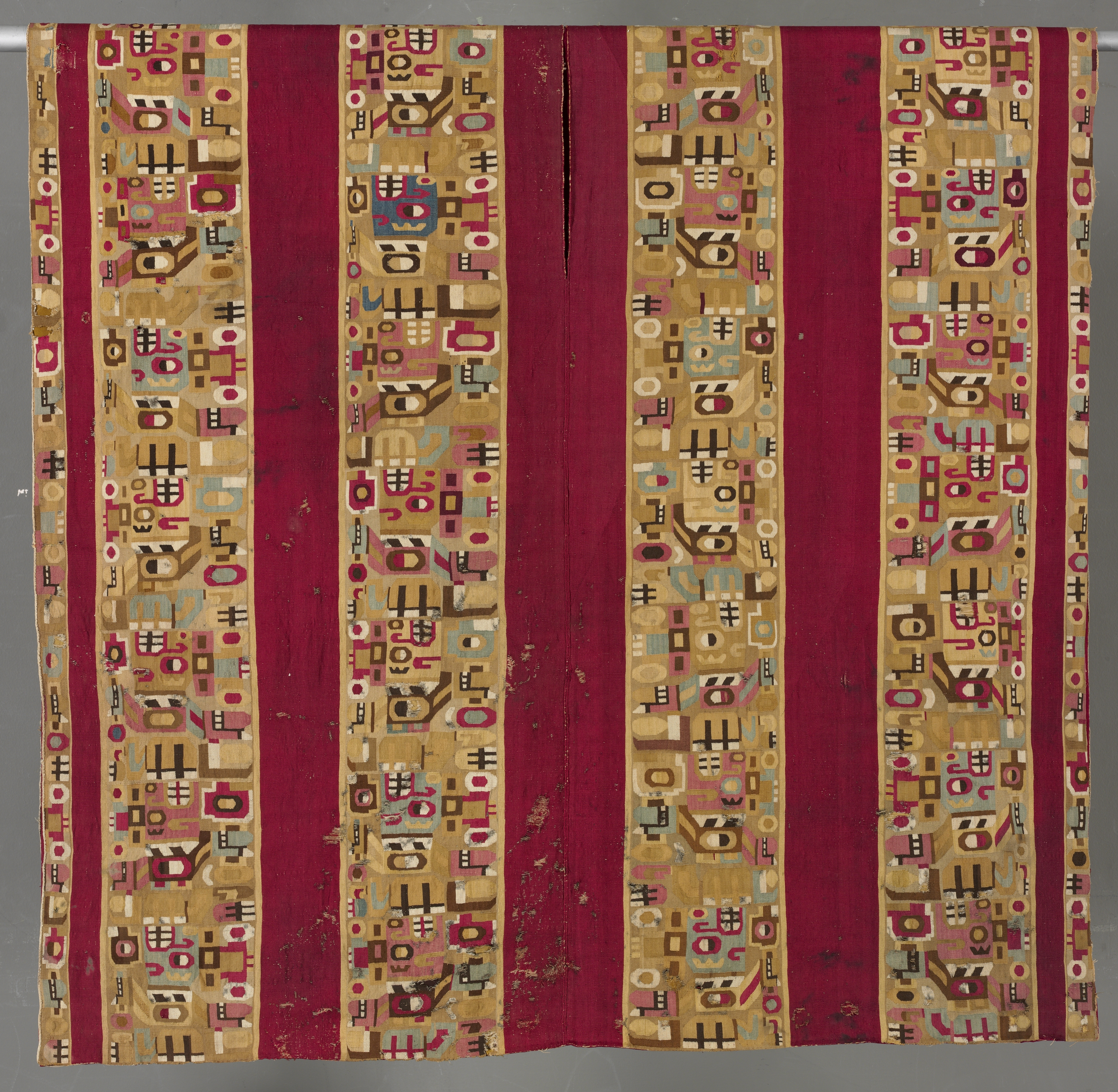 Red fabric with five vertical panels. Two outer and two inner panels are tan with multicolored geometric designs and figures. The center panel is solid red. The geometric designs include shapes such as rectangles, circles, lines, and abstract designs. The colors are red, brown, tan, blue, and cream. Tunic with Sacrificer by_unknown.