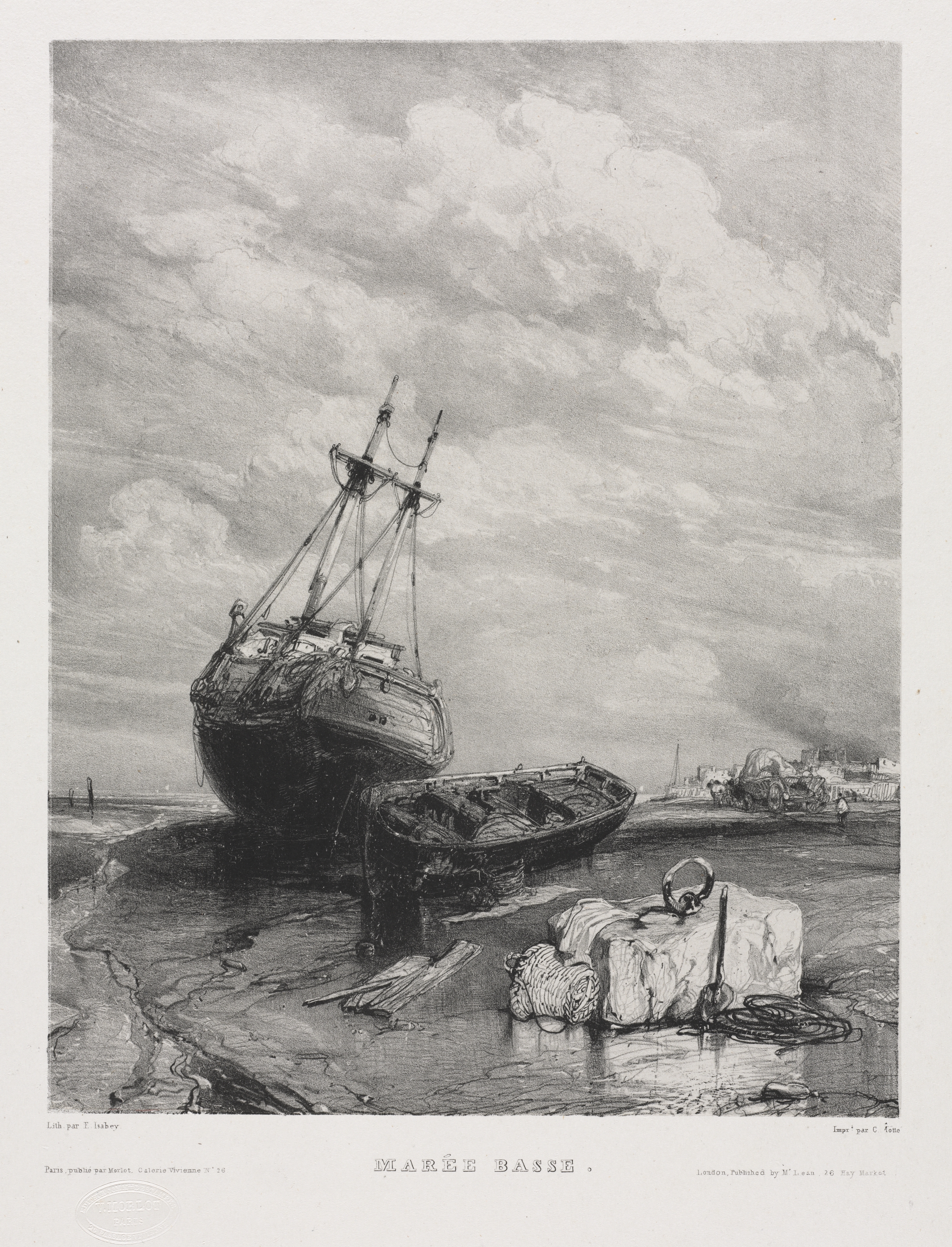 Black and white depiction of a ship on a beach. The ship has a hull with a pointed bow and three masts. Ropes and pulleys are visible on the ship. The ship is on a beach with wet sand and small pools of water. A pile of ropes and nets sits on a raised piece on the beach in the foreground. Another boat sits on the beach behind and to the right of the main ship. In the background on the right there are more boats and a horse-drawn cart. The sky above is cloudy. The title at the bottom reads "MAREE BASSE".
