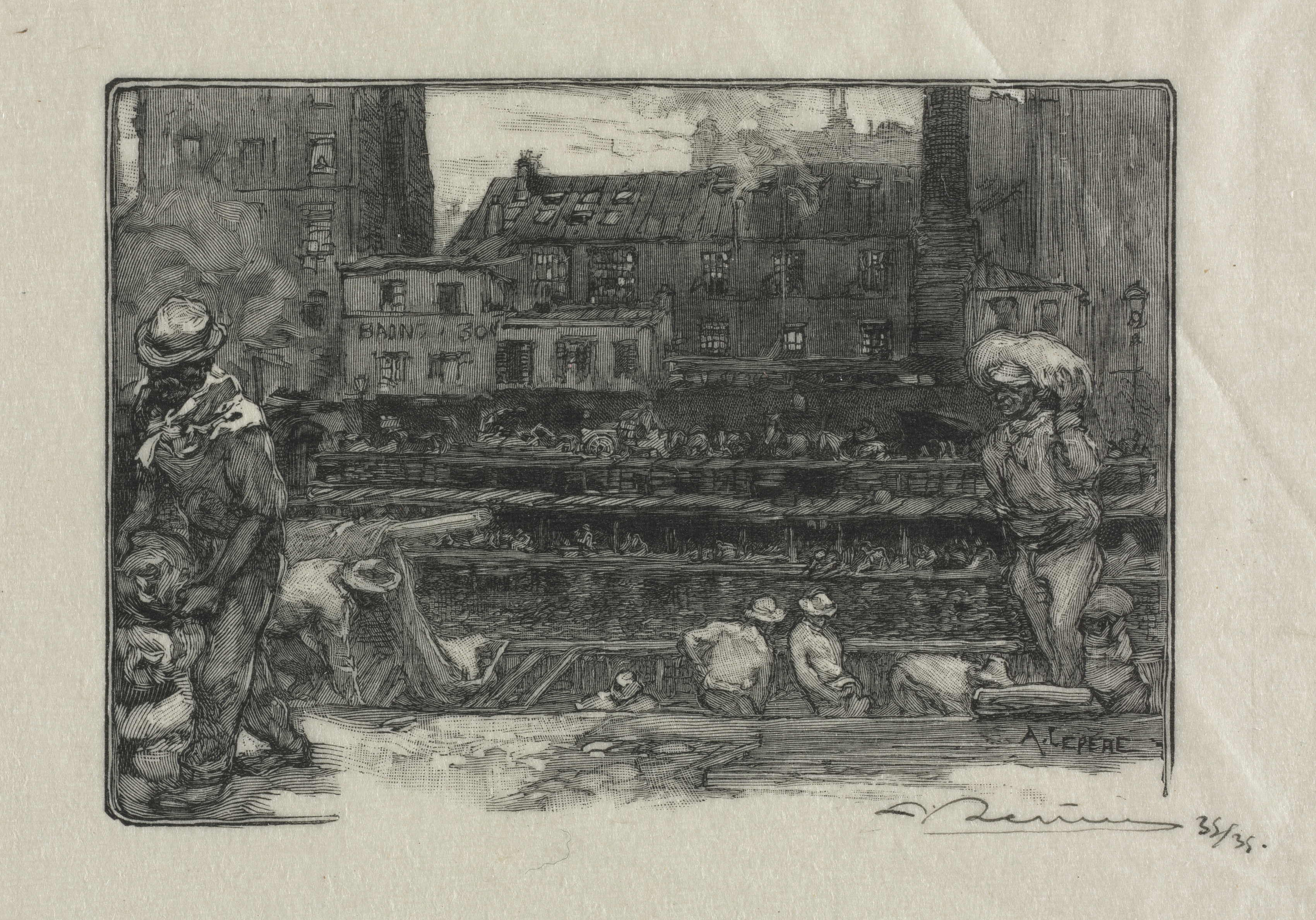 Black and white etching of a city scene. A canal with a bridge crossing over it. Several people on bridge and on edge of canal. Buildings in background. Two men on edge of canal unloading sacks. One man on left standing and holding sack. Two men on right sitting on edge. Several people in background on bridge. A sign on a building reads "Hair & Son". The sky is cloudy. The artwork is rectangular. The artist's signature in bottom right.