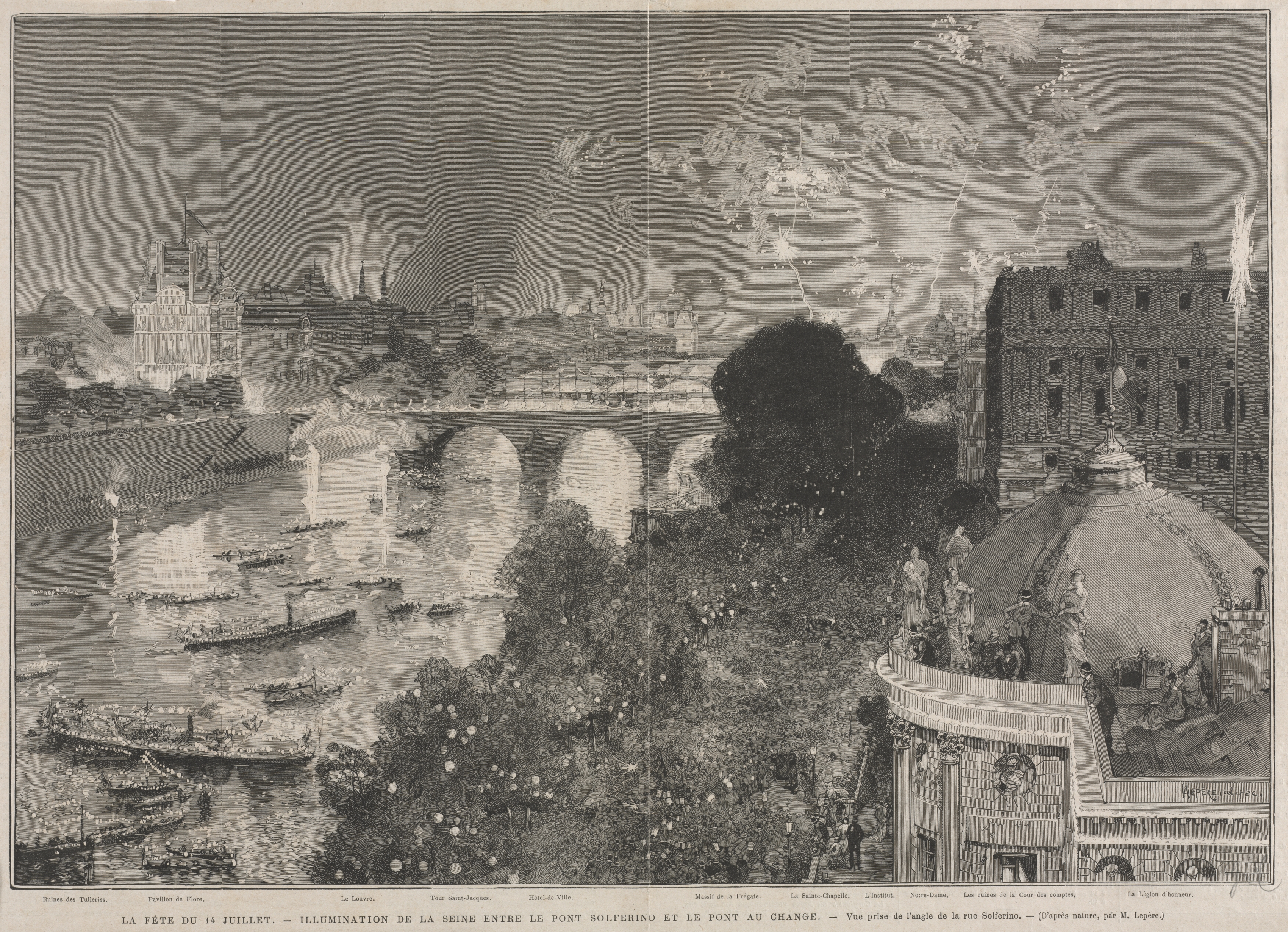 Black and white image of a city scene. A bridge with four archways spans across a river. Boats are on the river, decorated with rows of lights along their sides. The sky above is filled with fireworks. A tree-lined riverbank with people is in the foreground. A large building with a domed roof and a statue on top is on the right side. The image is a drawing or engraving, with detailed lines and shading. Text is printed along the bottom.
