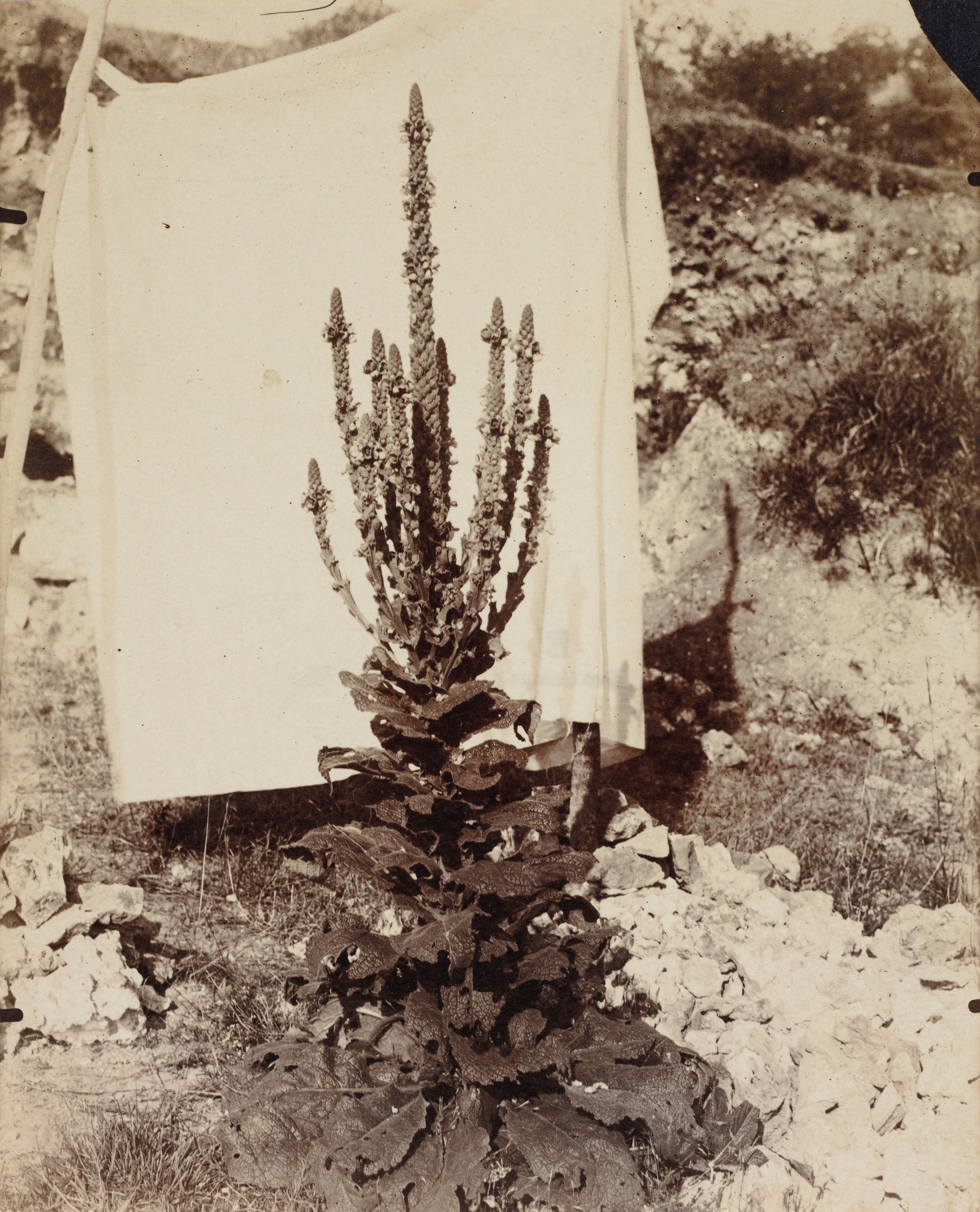 Black and white photograph. A plant with a tall stem and many small flowers at the top and large oval leaves at the base grows from the ground. A sheet hangs on a line behind the plant. The ground around the plant has small rocks and pebbles. The background shows a rocky hillside with sparse vegetation.