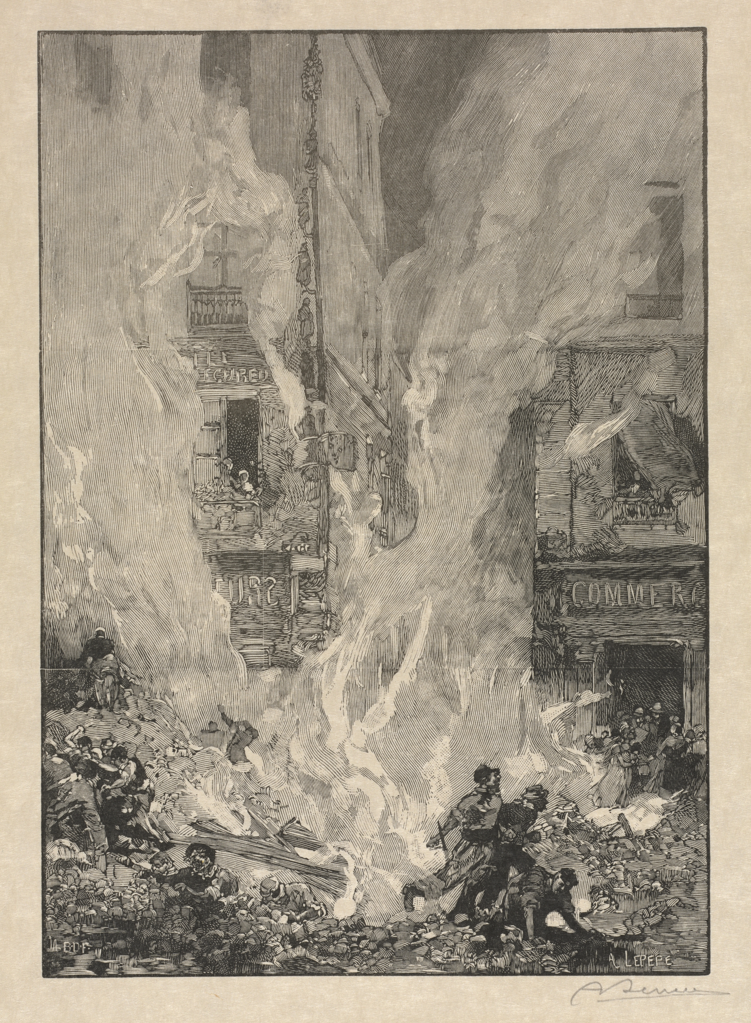The image depicts a city fire. A large building is engulfed in flames and smoke on the left. The building has multiple stories with balconies and what appears to be a sign that reads "COMMERCE" on the bottom right. Flames are licking at the windows and smoke is billowing out. To the right, another building with a sign is partially obscured by smoke. People are on the ground in the foreground. The people are dressed in clothing typical of the late 19th or early 20th century. The scene is chaotic, with debris scattered around. The illustration is in black and white. The style is detailed and realistic. City Fire by Auguste Louis Lepère.