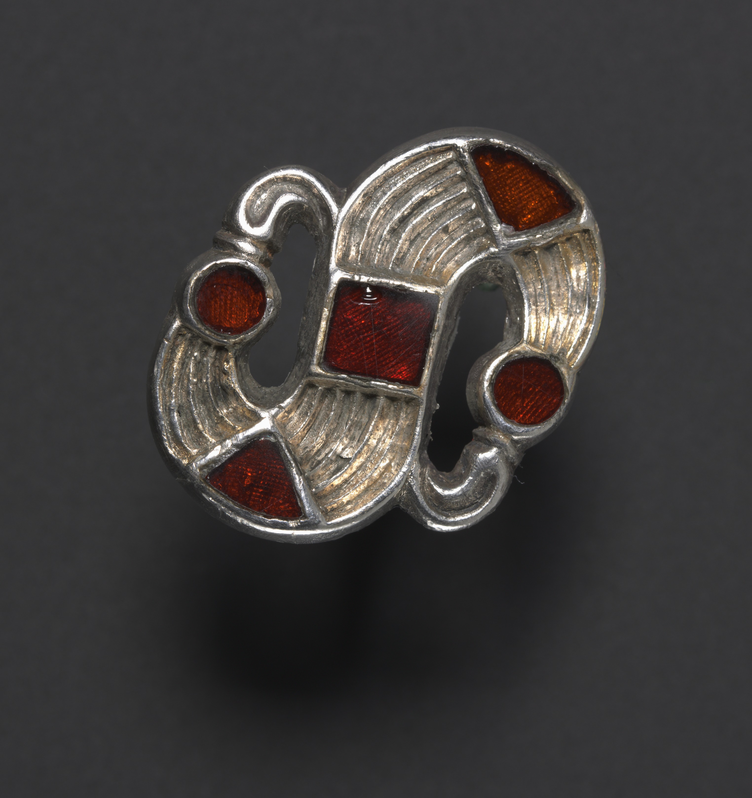 Silver fibula, S-shaped, with six red glass or enamel inlays, rectangular, triangular and circular in shape, set in a textured silver frame. The frame has lines etched into it, adding texture. The brooch is symmetrical, with the two ends curled inwards. The background is dark gray. S-Shaped Fibula by Tara.