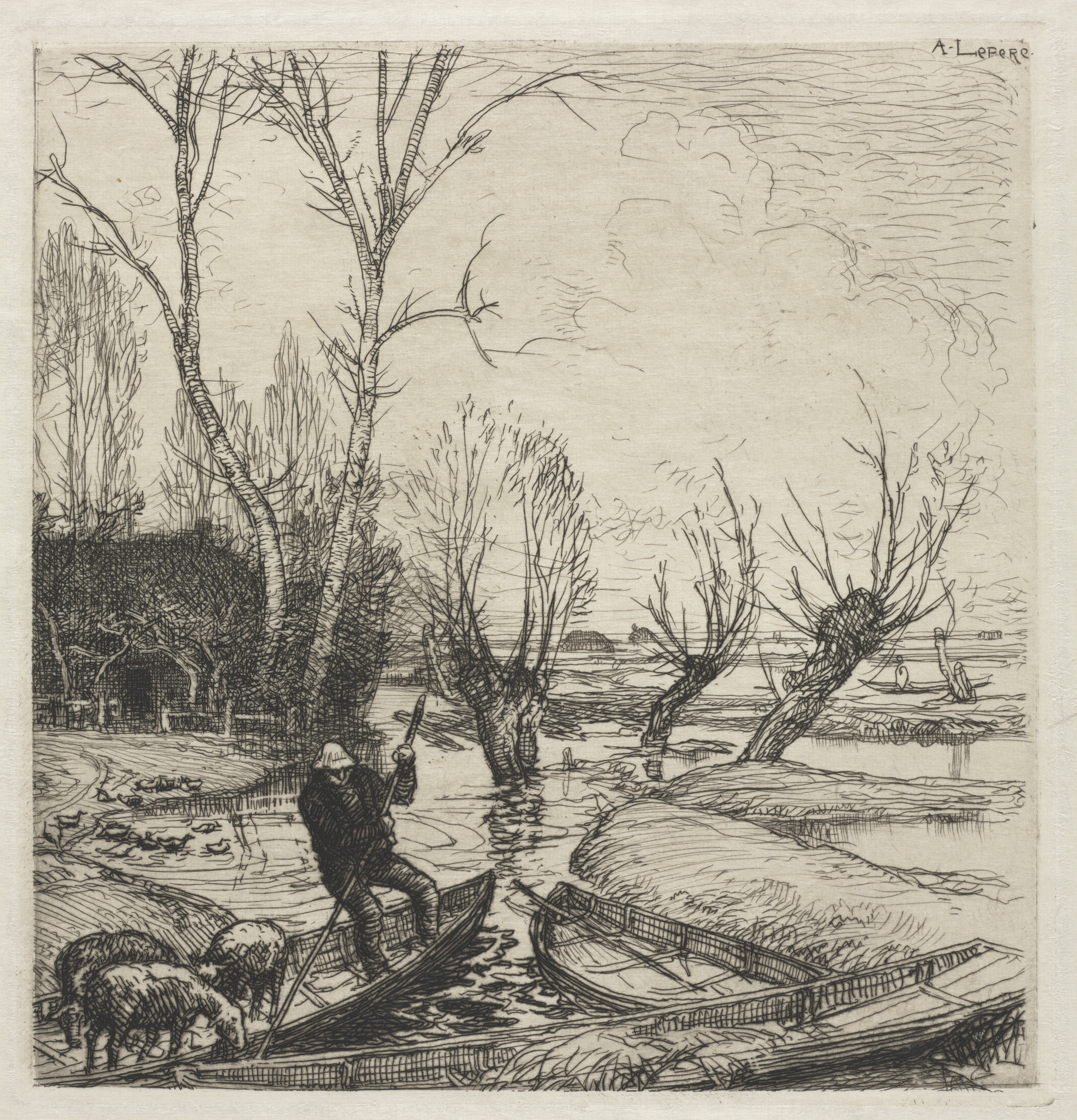 Man standing in small boat with pole, three sheep on shore. Leafless trees, bare branches. Man wearing dark clothing and hat. Two small boats in water. Shore with grass and trees. Distant buildings. Gray sky. Signed "A.Lepère" in top right corner. Image in black and white.