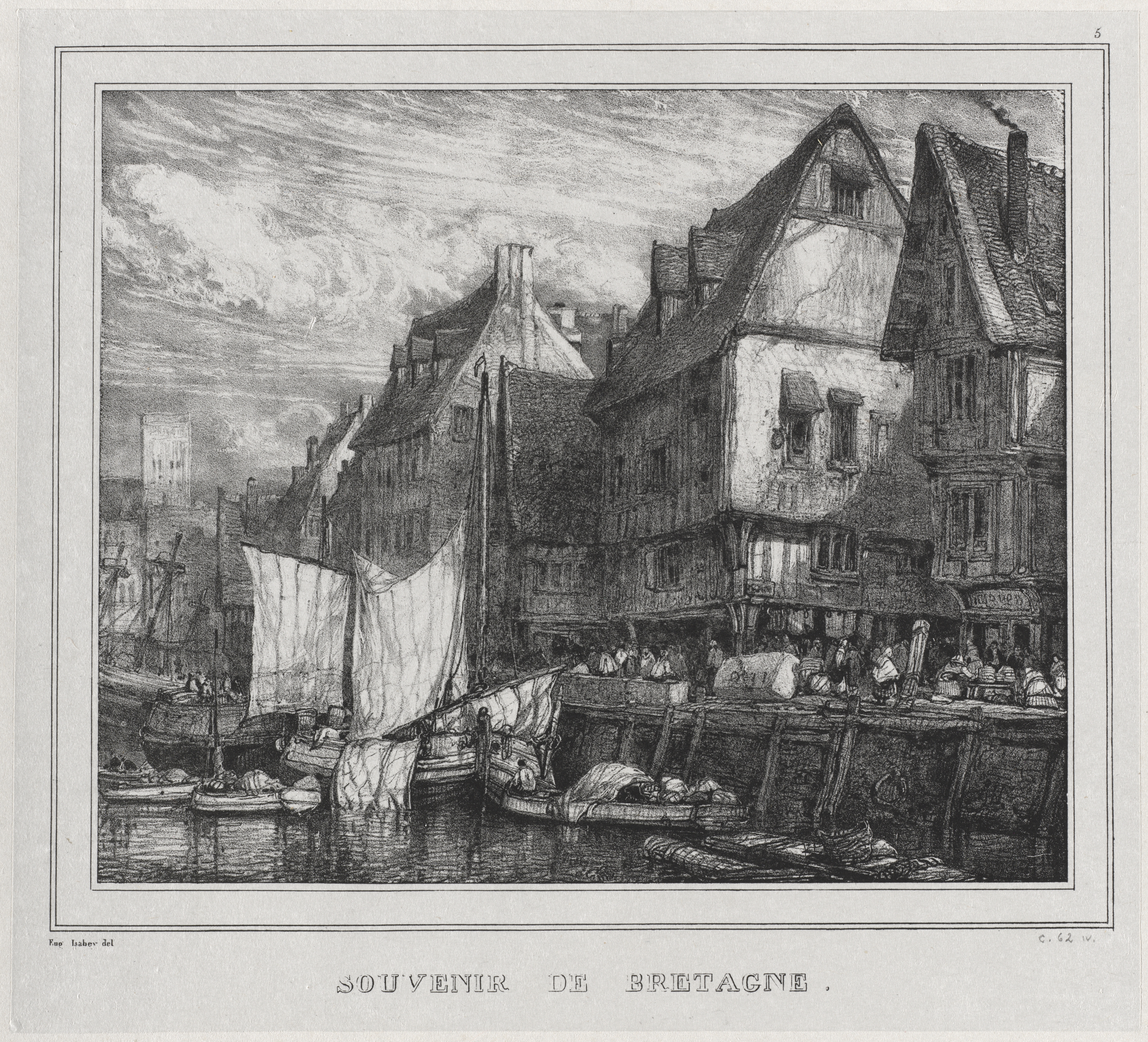 Black and white drawing of a harbor scene. A large building with a steeply pitched gable roof is on the right. Several smaller buildings are on the left. Boats are in the water on the left. People are standing on a dock on the right. The sky has many clouds. The image is in a thin black border and a thicker gray border. Text at the bottom reads "SOUVENIR DE BRETAGNE".
