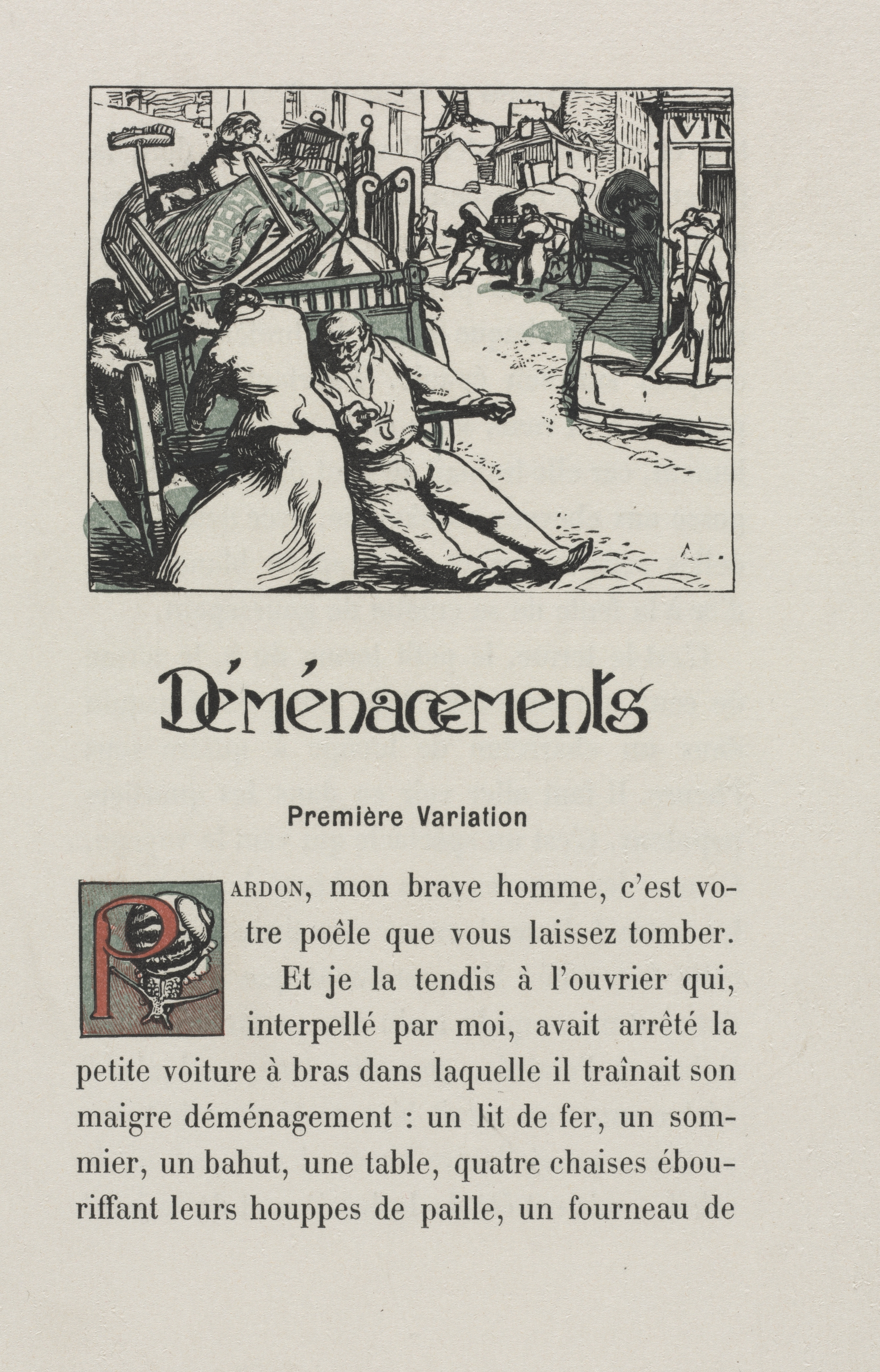 Black and white illustration of a man sitting on a curb; he has one leg stretched out and the other bent. He wears a shirt, vest, and pants. A large pile of furniture sits atop a dolly behind him. The dolly and furniture are positioned on a cobblestone street. A man to the right stands in a doorway. Buildings and another person are in the background. The image is bordered by thick lines. Below the illustration, a large title in black text reads "Demenacements" and smaller text reads "Premiere Variation". A decorative initial and several lines of small text follow. The background of the image is off-white.