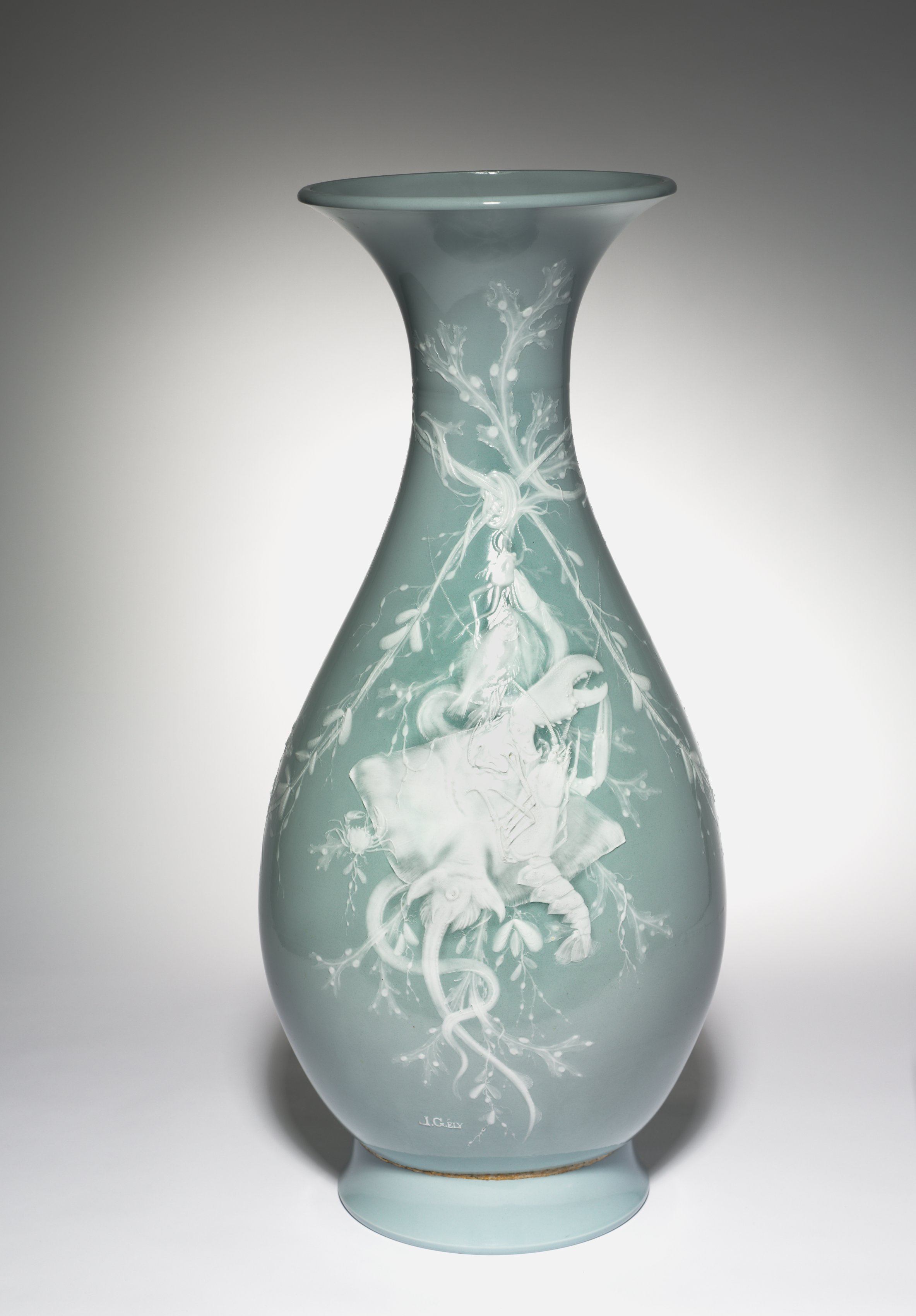 The vase, named Bertin, is by artist Jules-Constant Peyre. The vase is bulbous and made of glass. The vase is seafoam green with white decoration. The top of the vase flares out. The body of the vase tapers in as it gets closer to the base. The base is flat and circular. The base has a thin gold line around it. There are white floral decorations on the vase. The background is white with a gradient to dark gray. The vase casts a shadow.