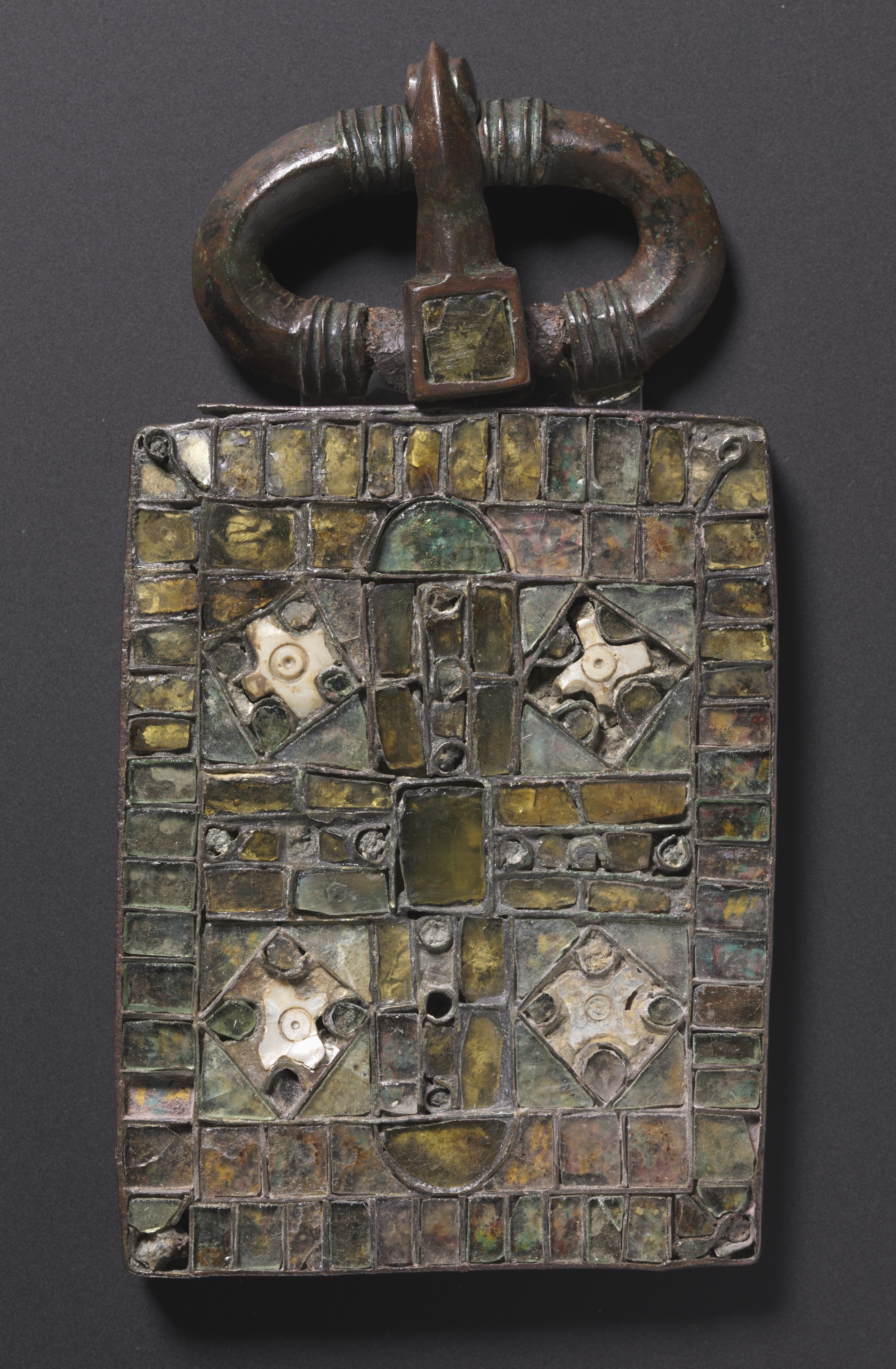 The belt buckle by Alexander Calder features a rectangular plate with a mosaic design made of small, square and rectangular pieces of metal in shades of gold, silver, and bronze. The plate has rounded corners and a mix of geometric shapes, including triangles, circles, and rectangles, arranged in a decorative pattern. A large, rounded metal loop with ridged details is attached to the top of the buckle. The buckle has a weathered appearance with visible signs of aging and wear. The background of the image is dark gray.