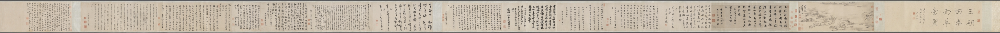 The image depicts a long, narrow scroll with a beige background. The scroll contains Chinese calligraphy and characters written in black ink. The text spans the length of the scroll, with some areas featuring more densely packed writing than others. A small illustration of a landscape with trees and a hut is on the right end. The overall appearance suggests an ancient or traditional Chinese artwork. The title of the piece is "Spring Rain Thatched Hut" and it is by Wang Jianzhang.