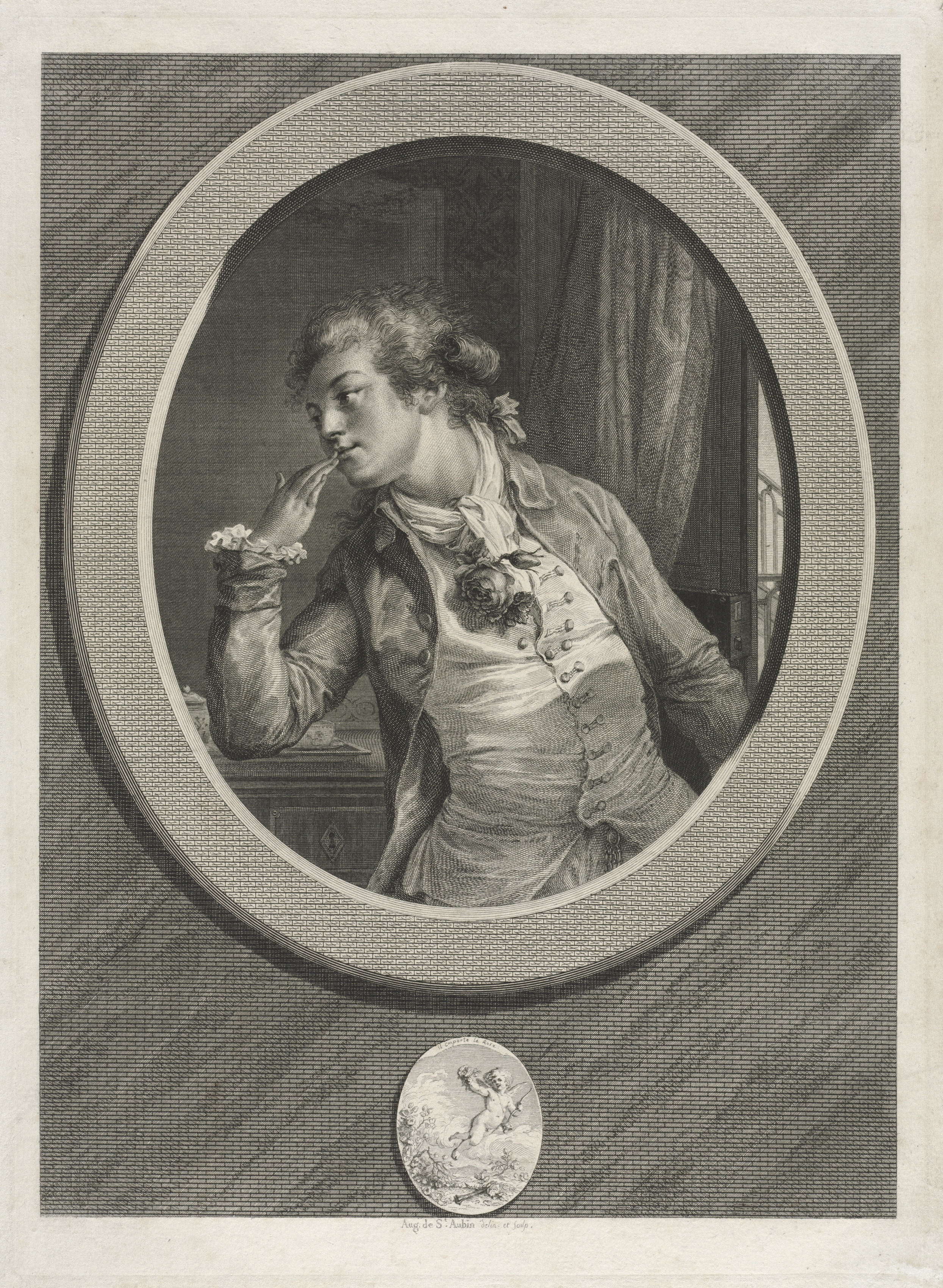Black and white image, oval shaped. A man in 18th-century clothing. The man has curly hair tied back with a ribbon. He wears a jacket with buttons down the front and on the cuffs, a ruffled shirt with a high collar, and a flower on his chest. The man leans on a table with his right hand and holds a pipe in his mouth. He looks to his right. The oval picture of the man is on a rectangular background. A small circular image is centered at the bottom. The circular image depicts two horses rearing up on their hind legs, surrounded by decorative elements.