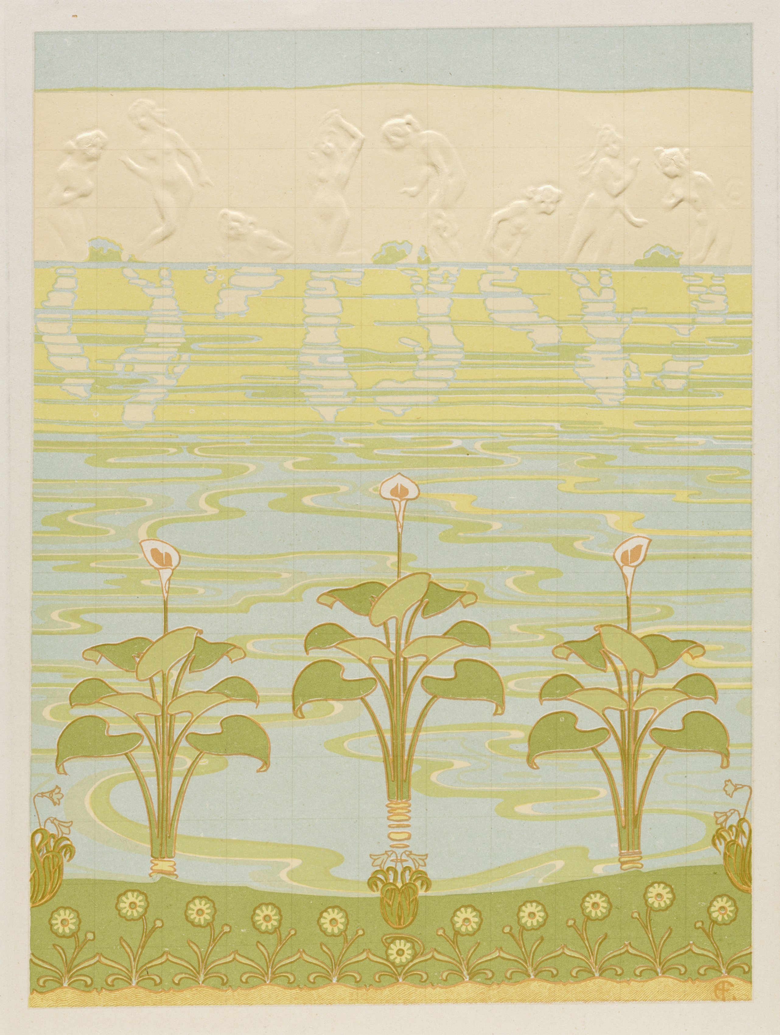 Rectangular artwork with a light blue border at the top. The top section features a beige background with raised white figures of people in various poses. The bottom section depicts a serene landscape: a green ground with a pattern of yellow flowers and leaves along the bottom edge; three green plants with rounded leaves and white flowers with brown centers in the foreground; and a body of water with ripples in shades of blue and yellow. The artwork showcases a combination of raised and flat elements.