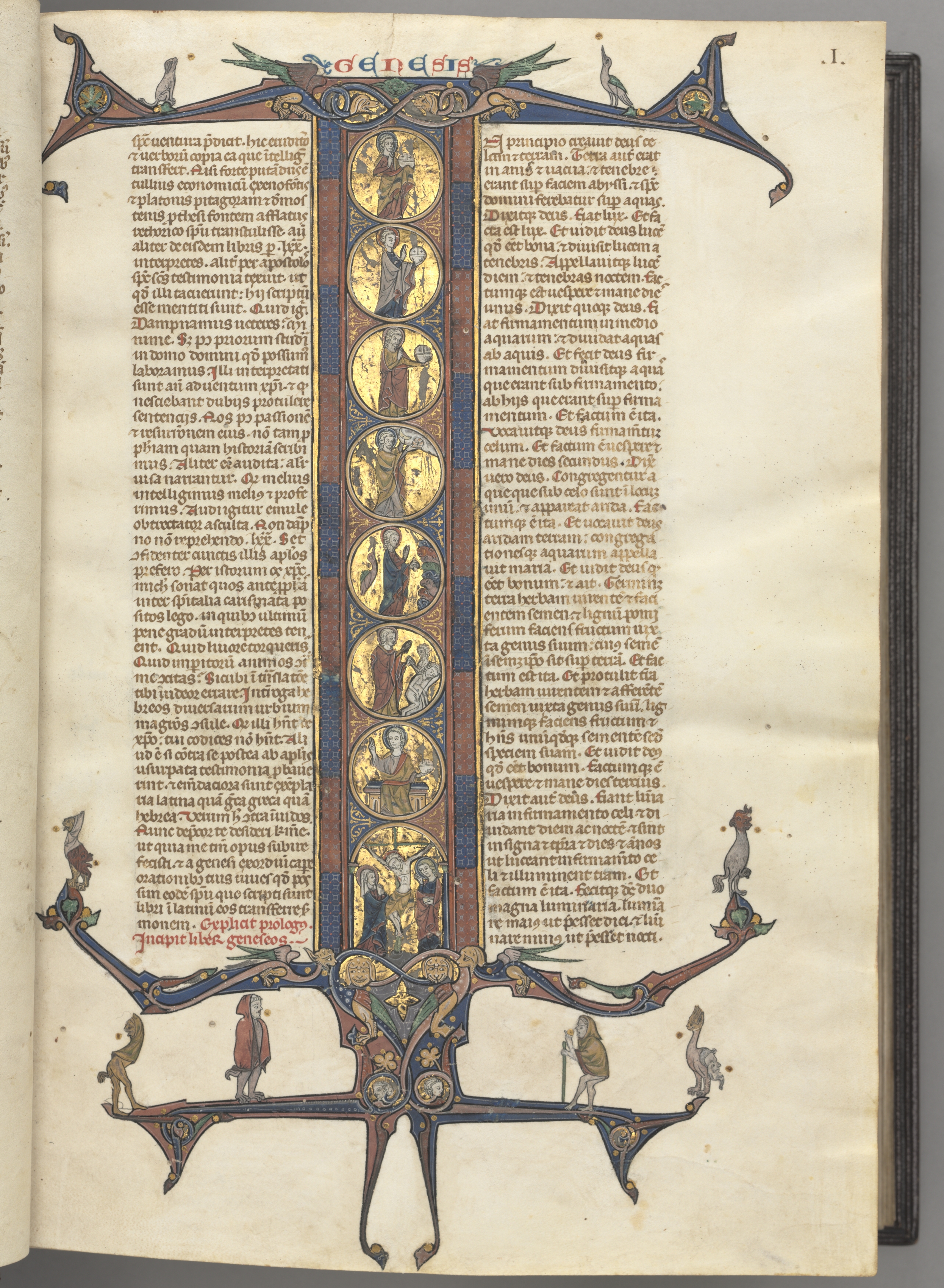Fol. 1r, Genesis, with a full-length historiated initial I, showing the Creation and the Crucifixion, all on burnished gold grounds, with diapered pink and blue frames and cusped dragon and foliage extensions at top and bottom, on which are perched a vari