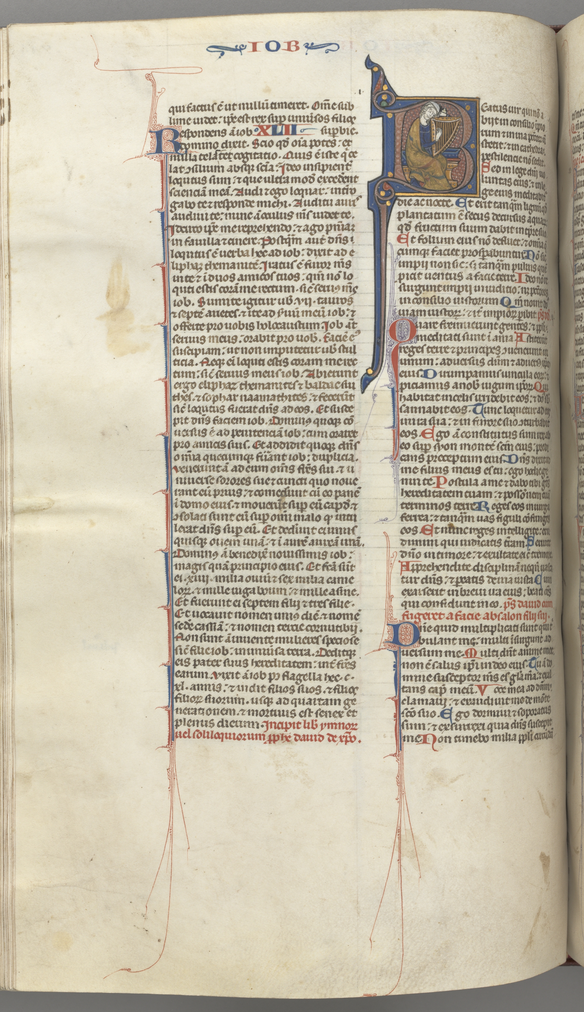 Fol. 205r, Job, historiated initial V, Job on the dungheap given a gold earring by one of his sisters
