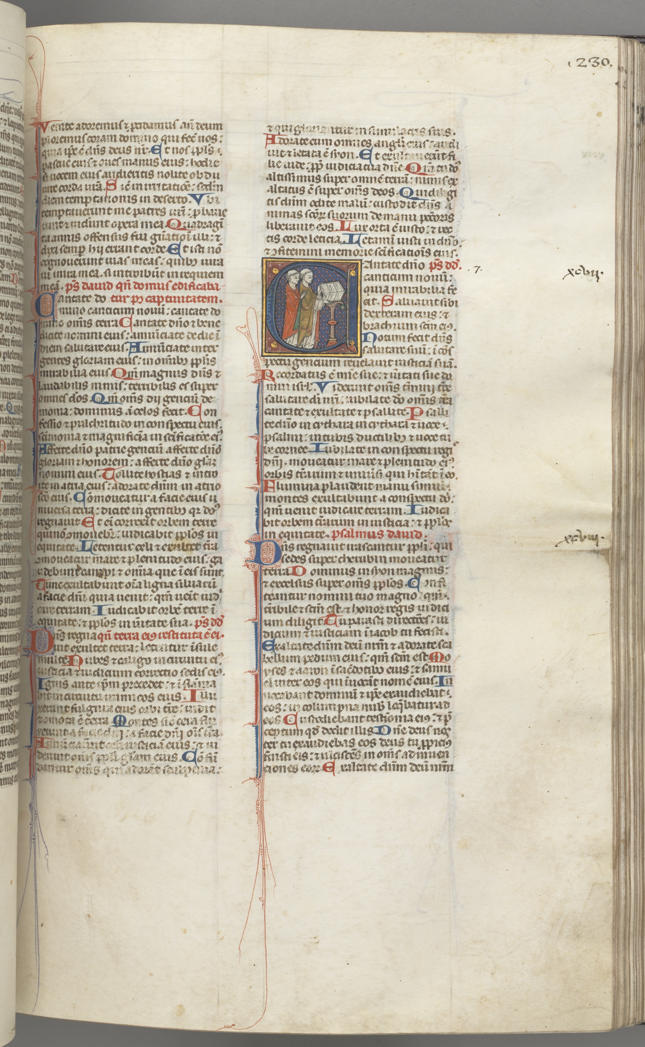 Fol. 230r, Psalm 97, historiated initial C, two clerics singing at a lectern.