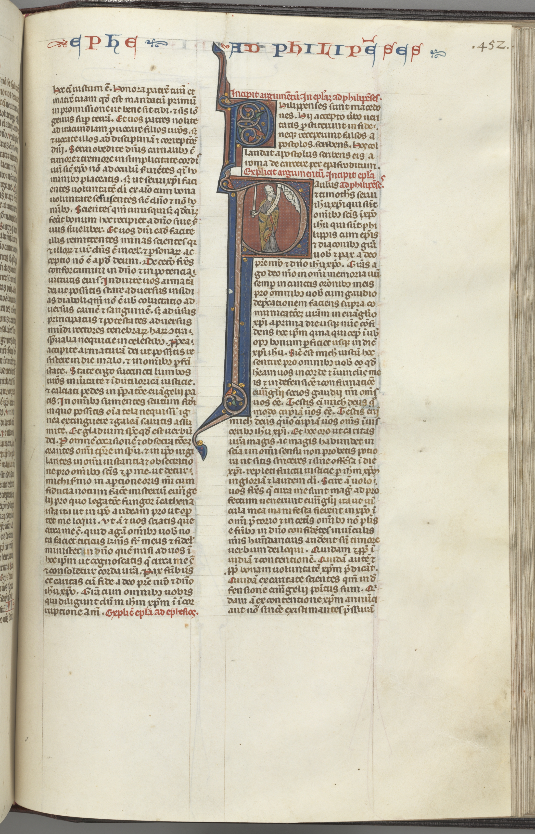 Fol. 452r, Philippians, historiated initial P, Paul standing with a sword and a scroll, talking to the bust of God above