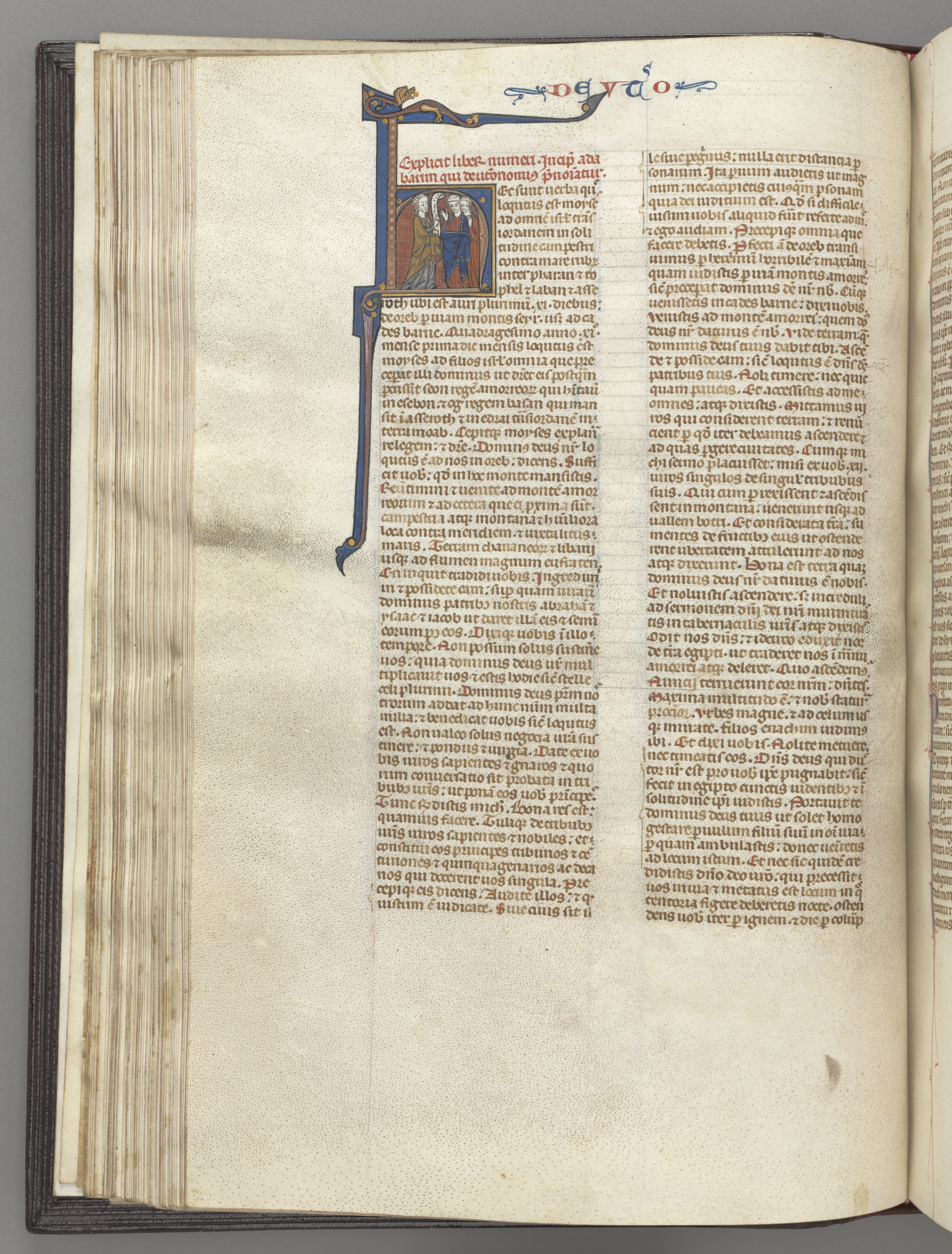 Fol. 62v, Deuteronomy, historiated initial H, Moses with horns and scroll preaching to two men