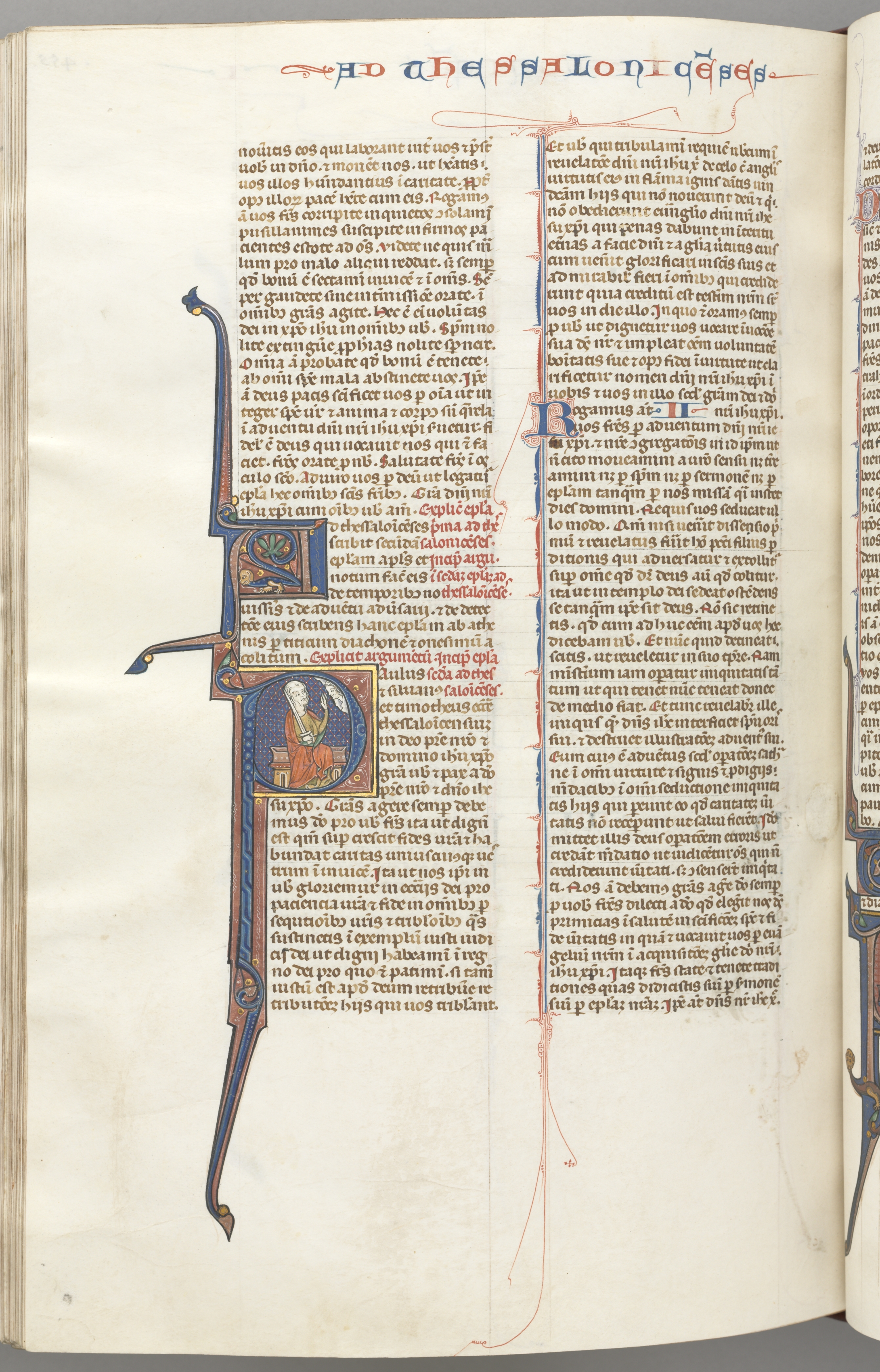 Fol. 454v,Thessalonians I, historiated initial P, Paul seated with a sword and a book, talking to the bust of God above